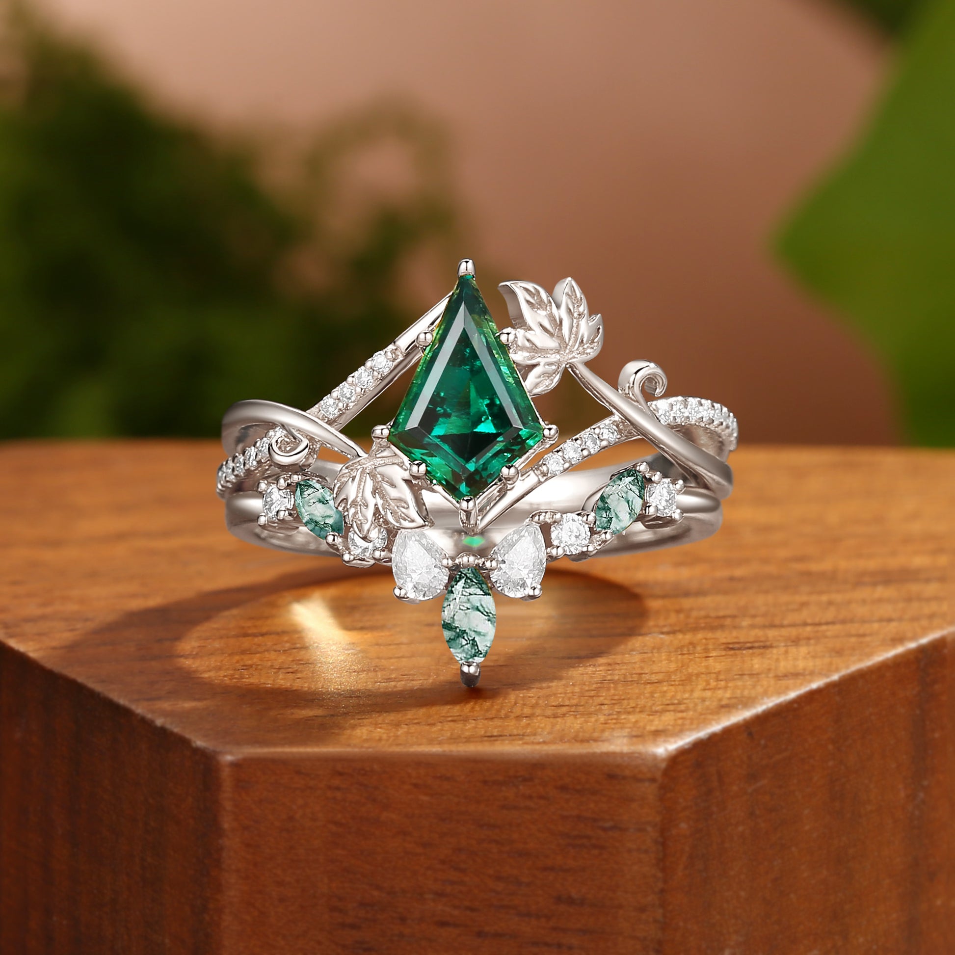 Nature's love story comes to life in Kalea - Unique Kite Cut Emerald Grape Leaf Twist Bridal Sets 2pcs. Like vines entwining in an ancient forest, the Moss Agate & Emerald accents symbolize a deep connection and timeless romance. Crafted in 14k/18k gold or platinum, this ring is more than just jewelry - it's a promise of growth, harmony, and forever love.