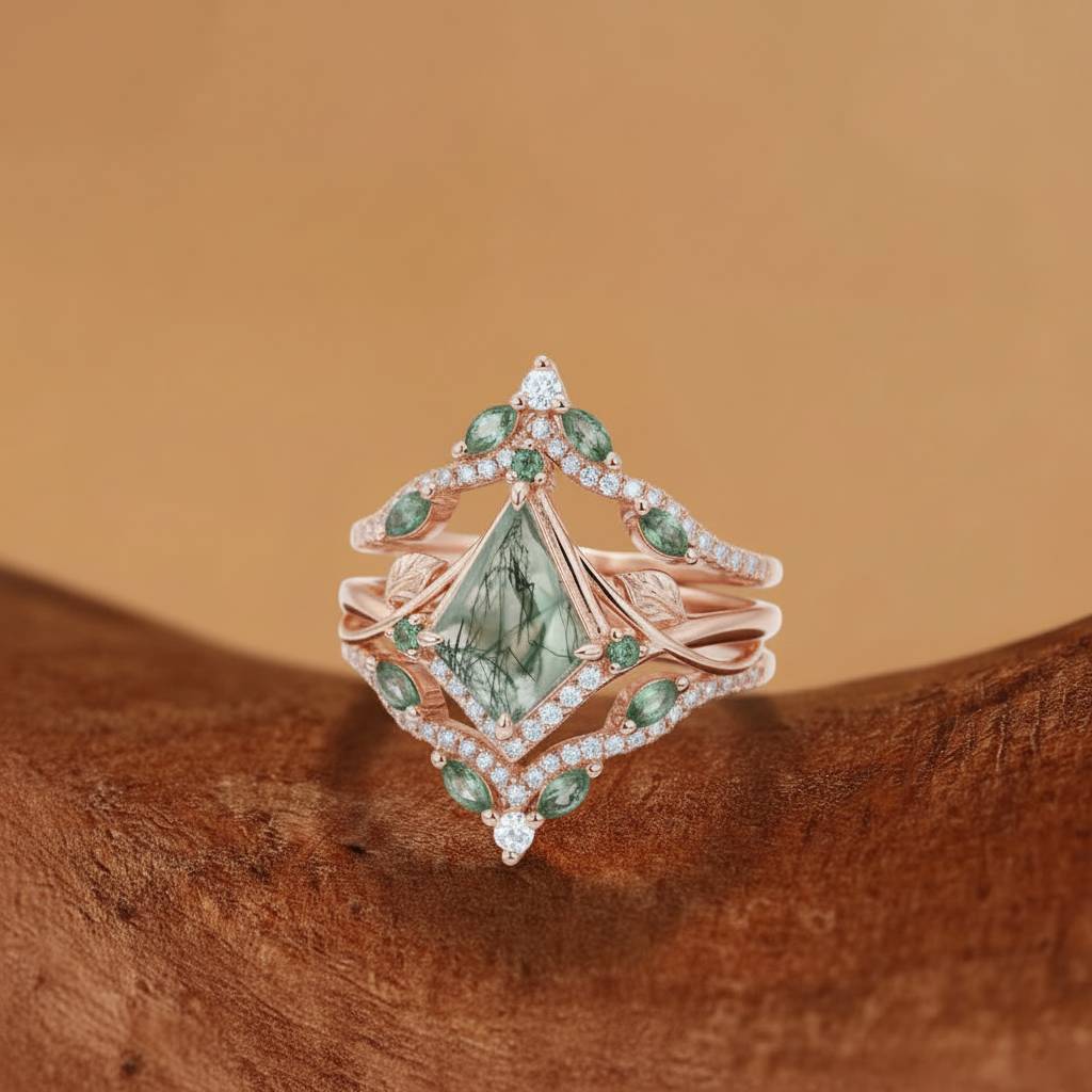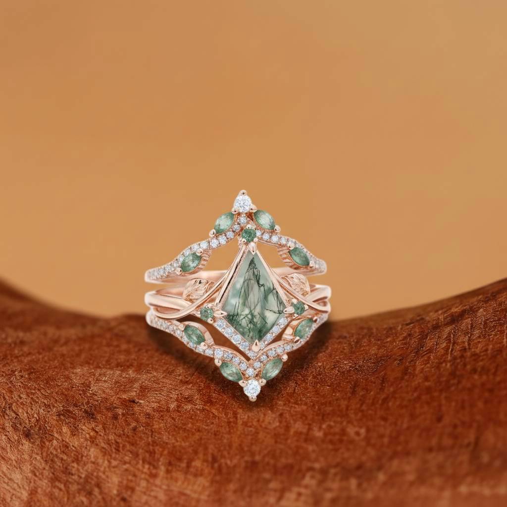 Enchant your look with the Kismet - Unique Bazel Moss Agate Kite Cut Vintage nature inspired Enhancer Bridal Set 2pcs. Crafted with a stunning kite cut design, these 2pcs rings feature a rare Moss Agate stone for a one-of-a-kind statement piece. Elevate your style and embrace nature's beauty with this elegant set.