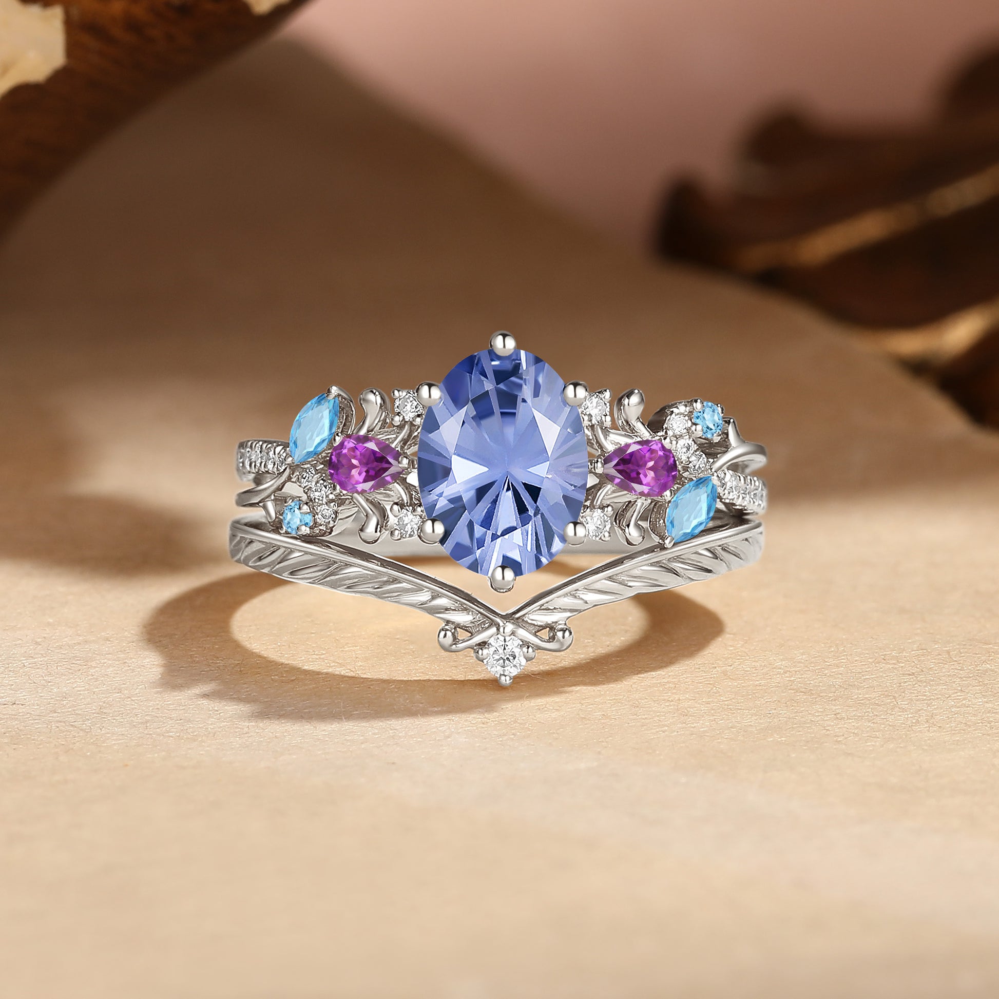 Meadow - Oval Cut Firework Cornflower Sapphire Filigree Engagement Ring Set 2Pcs