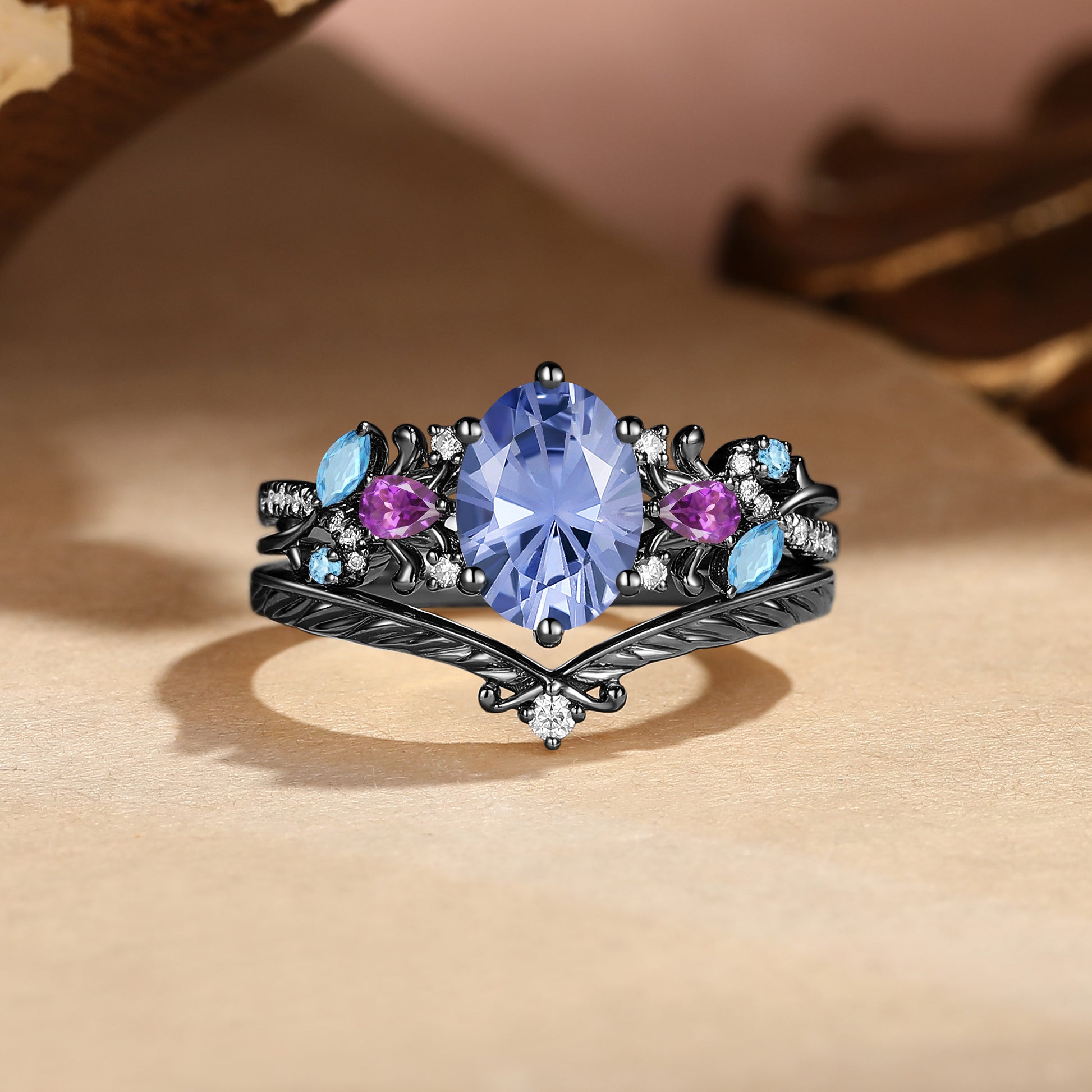 Enter a realm of dark enchantment with the Victoria Engagement Ring Set. Featuring Oval Cut  Firework Green Sapphire Grape Leaf Engagement Ring Set 2Pcs, this two-piece design is inspired by the mystical holly leaf, blending deep, rich hues with nature's magic. Perfect for the bride who seeks a bold, fantastical statement, Victoria captures the allure of a forgotten fairy tale filled with elegance and mystery.