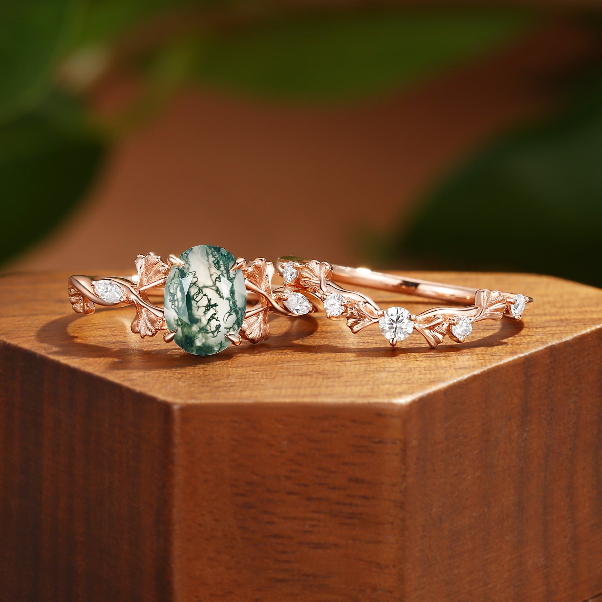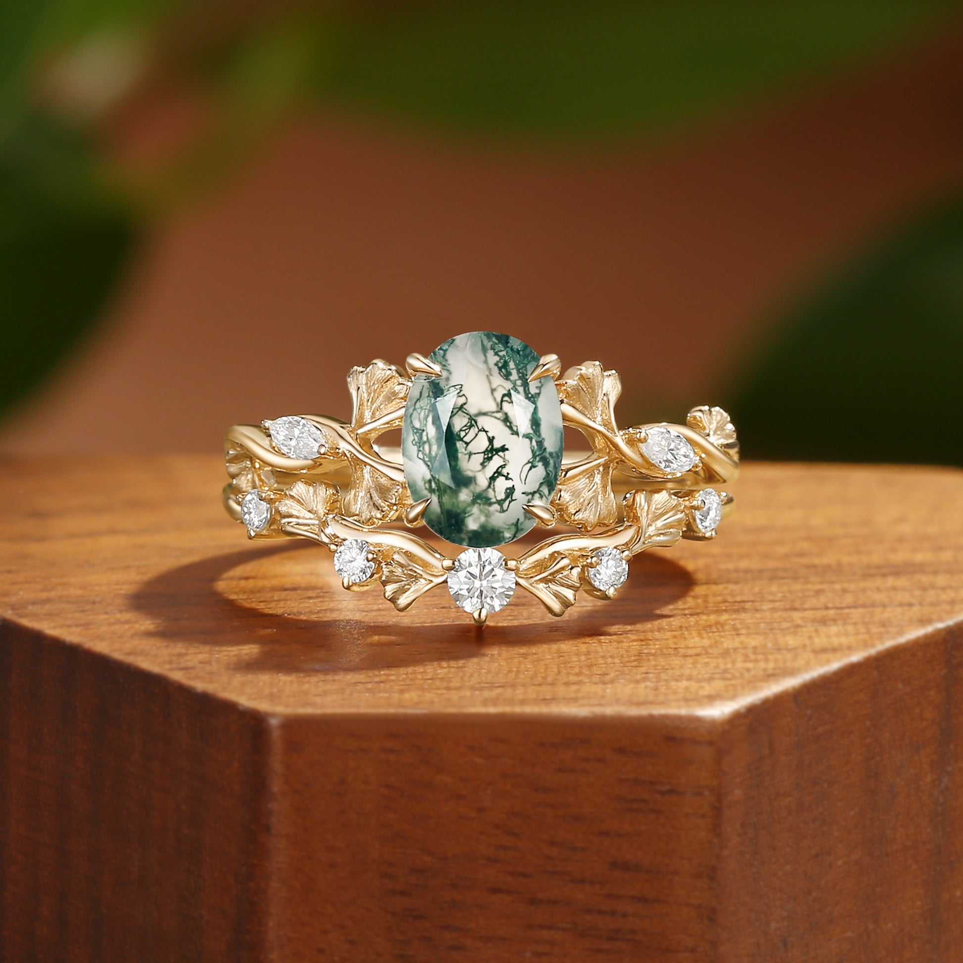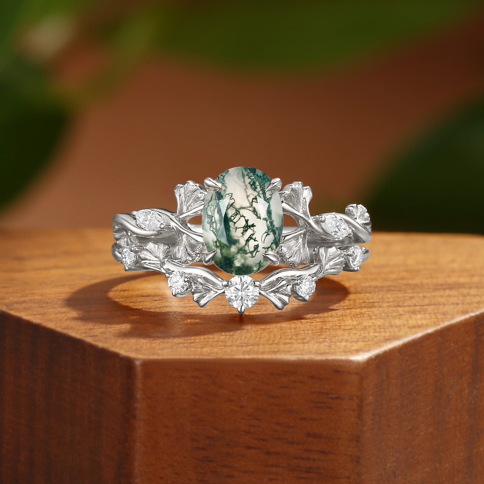 Reverie - Oval Cut Moss Agate Ginkgo Leaf Nature Inspired Engagement Ring Set 2pcs
