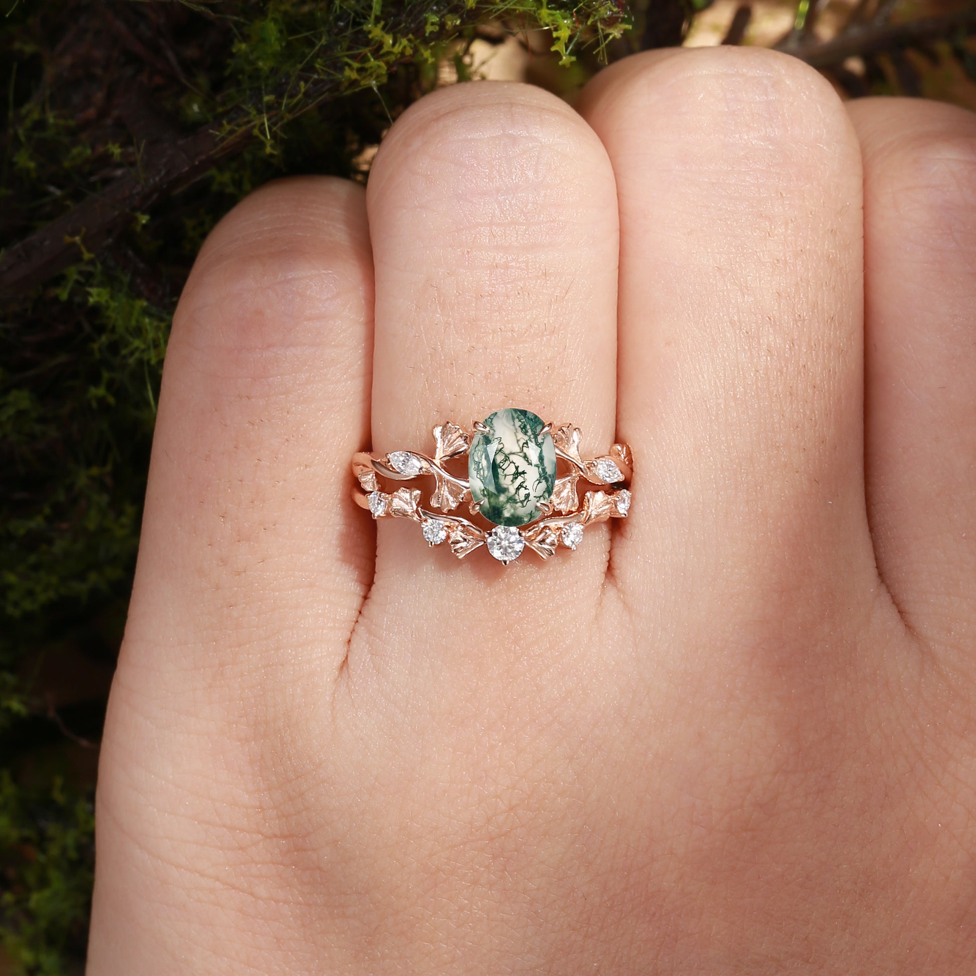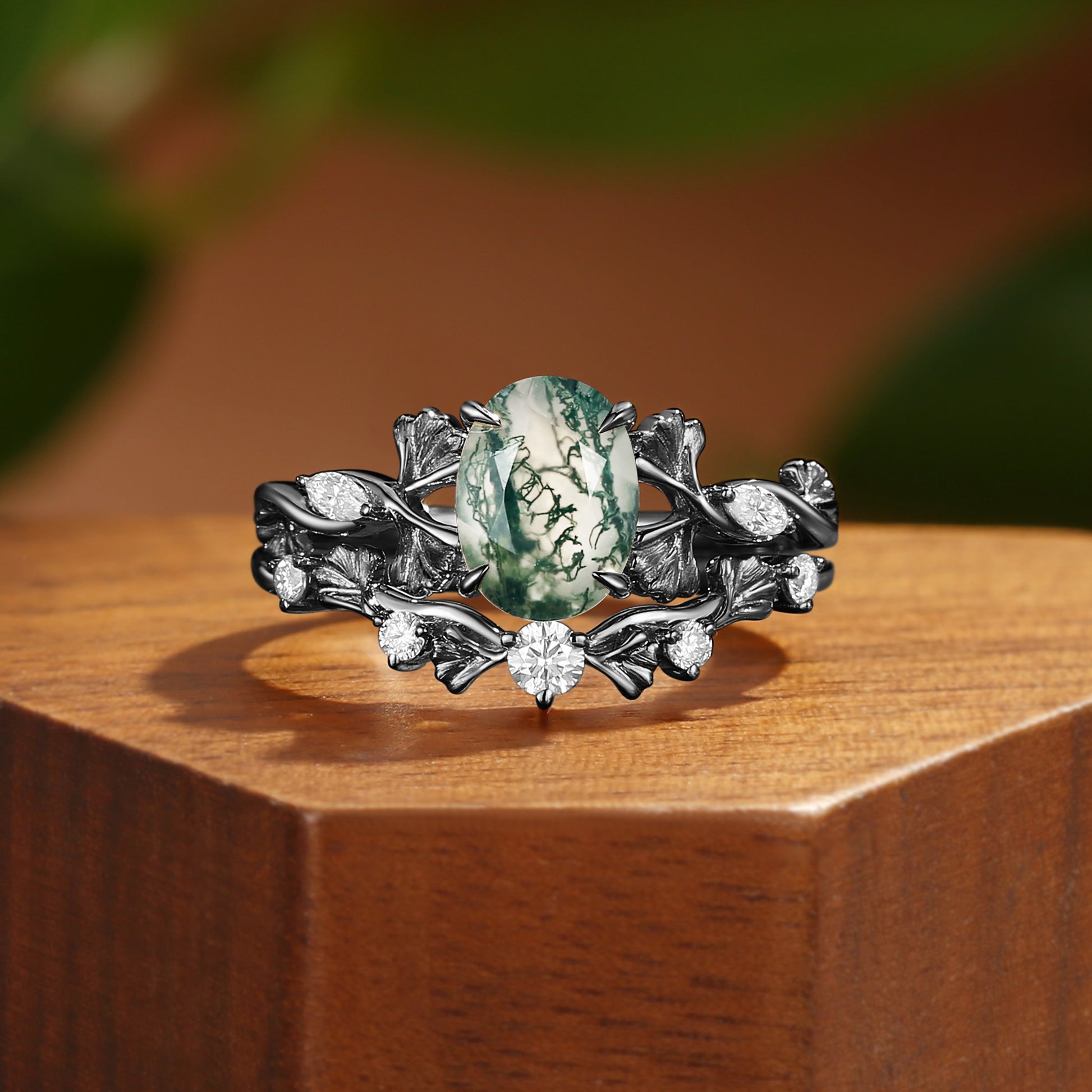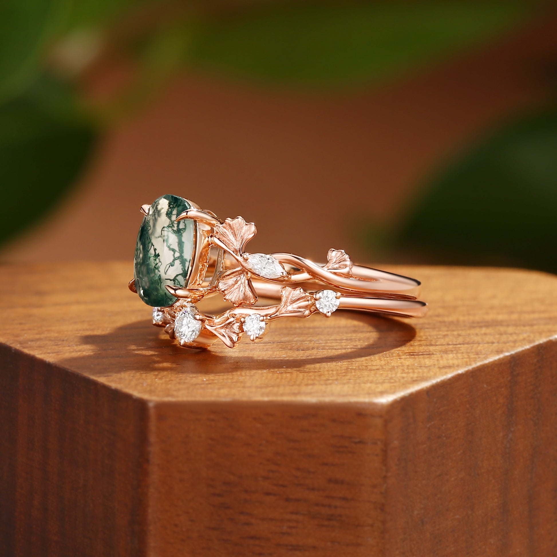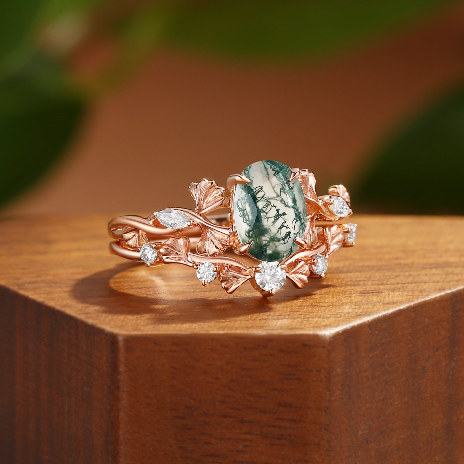 Reverie - Oval Cut Moss Agate Ginkgo Leaf Nature Inspired Engagement Ring Set 2pcs