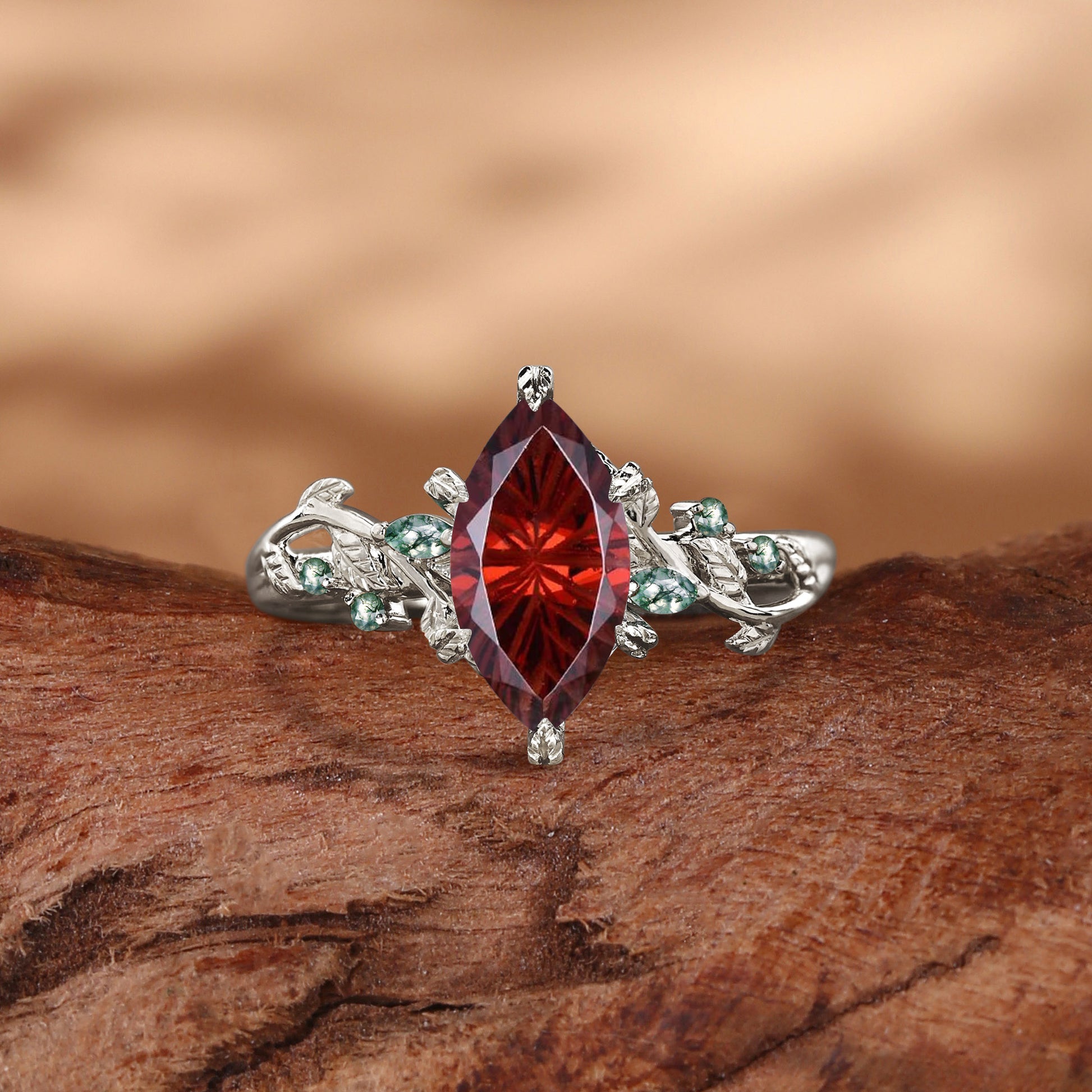 Nature Inspired Firework Marquise Cut Garnet Leafy Twist Engagement Ring