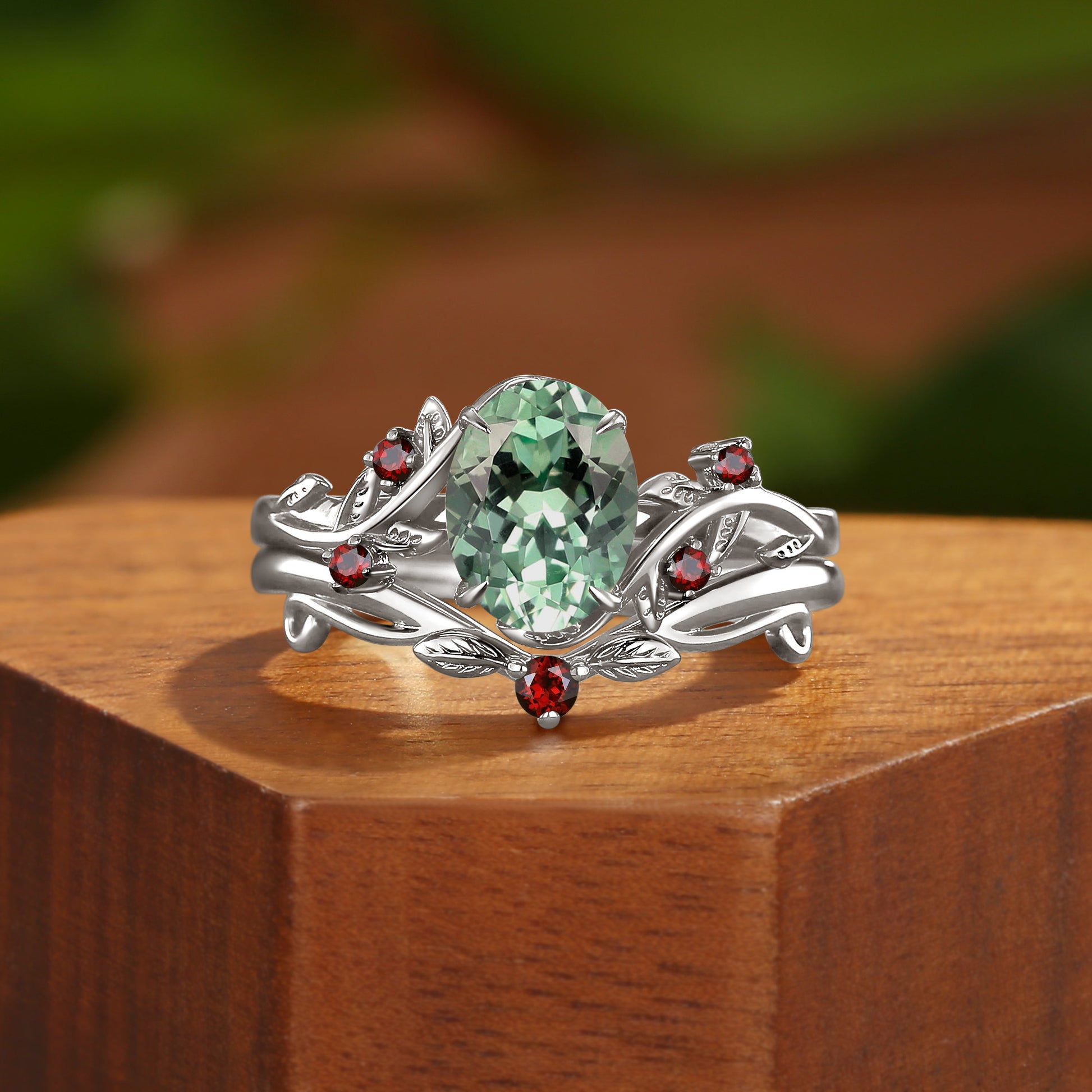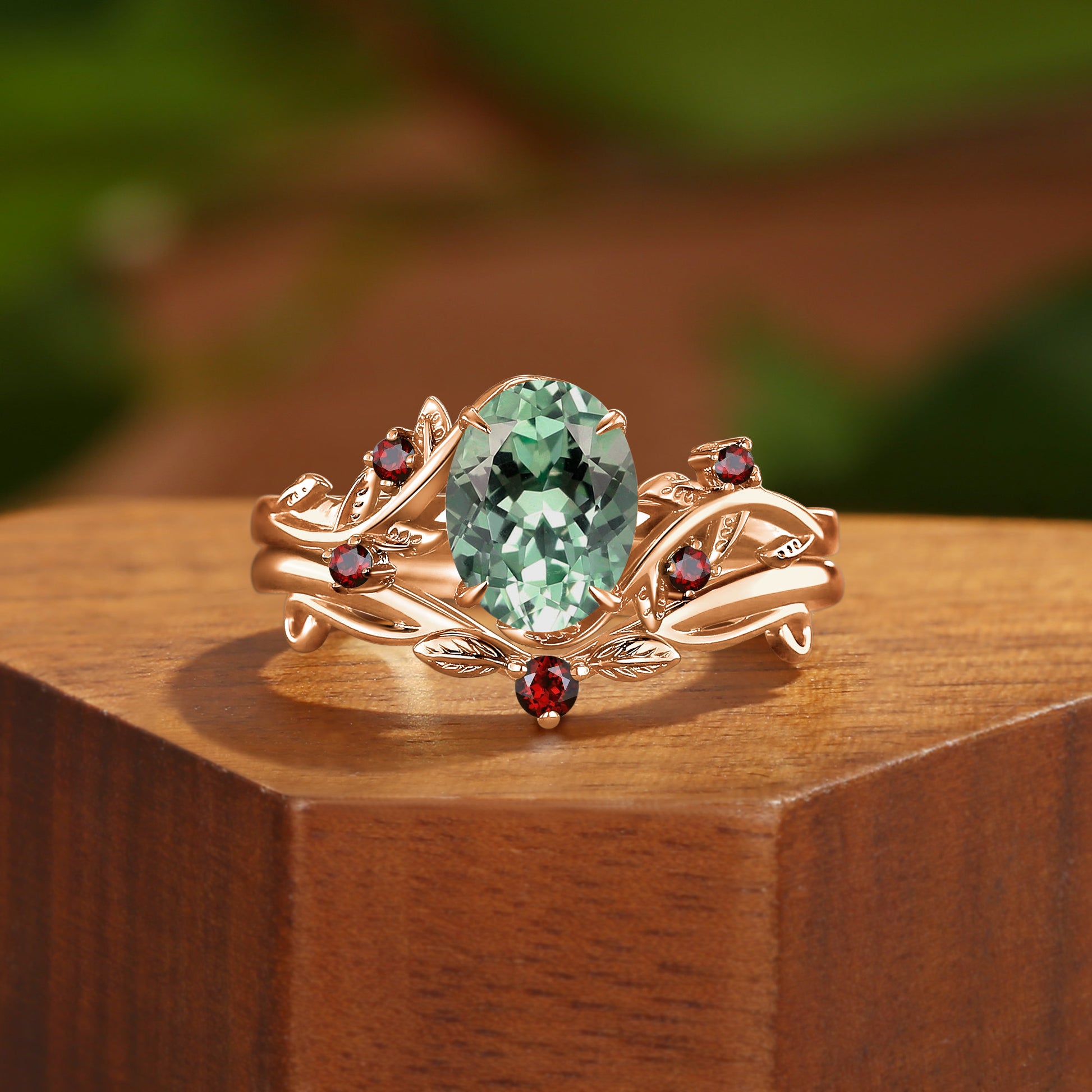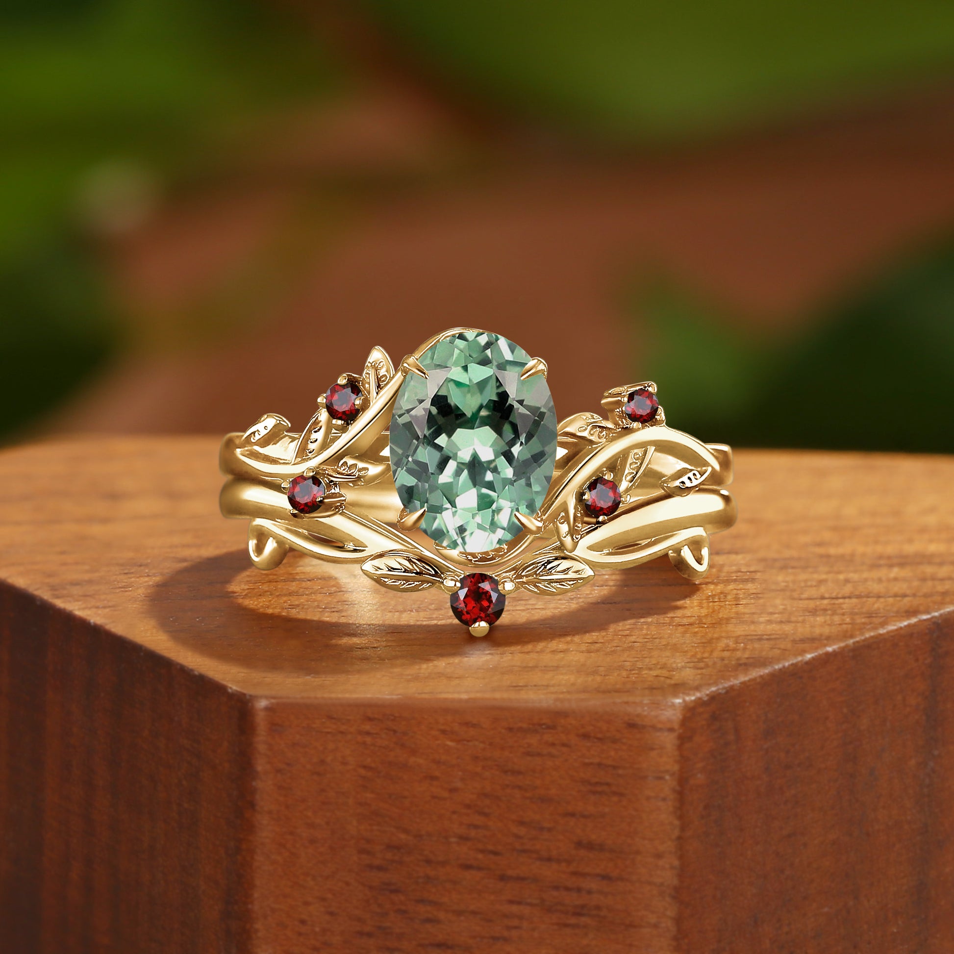 Ilaria - Vintage Green Sapphire & Leaf Cluster Bridal Set 2pcs