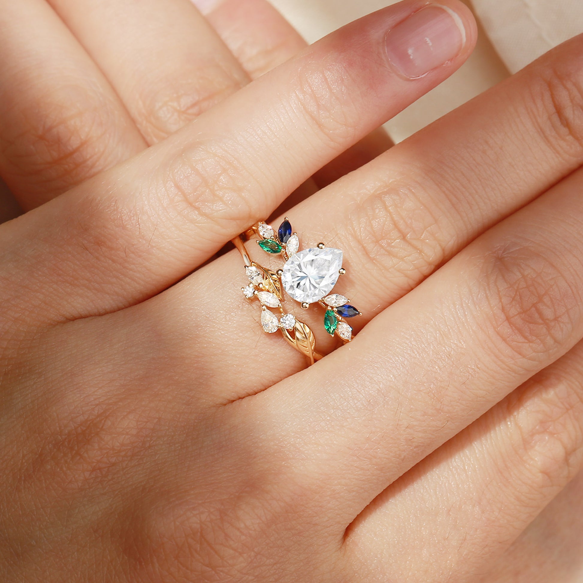 Abella - Pear Cut Moissanite & Sapphire & Emerald Butterfly Leaf Bridal Sets 2pcs