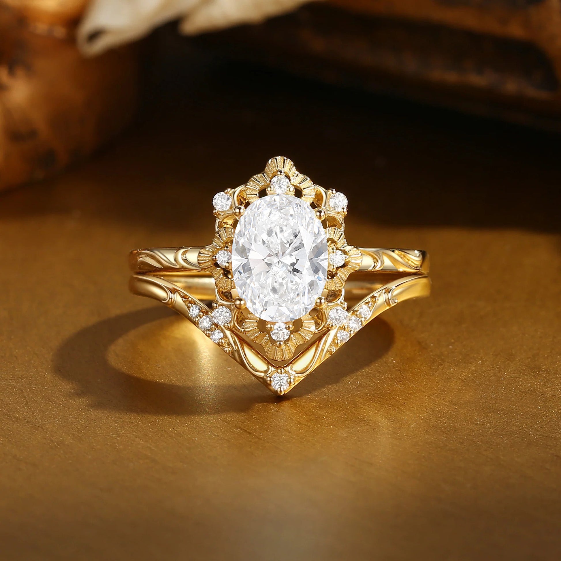 Bertille - Victorian Halo Oval Cut Lab Grown Diamond Engagement Ring Set 2pcs