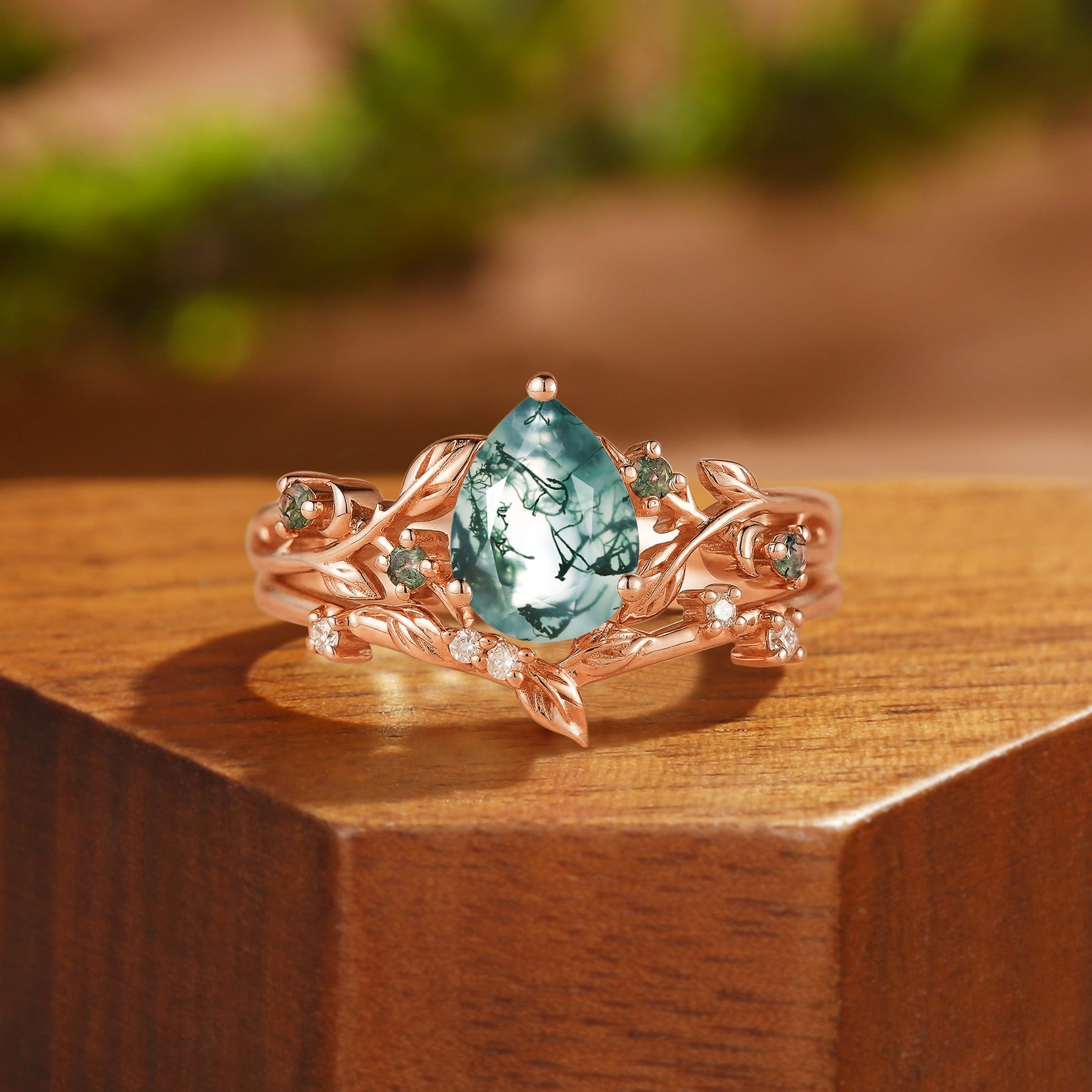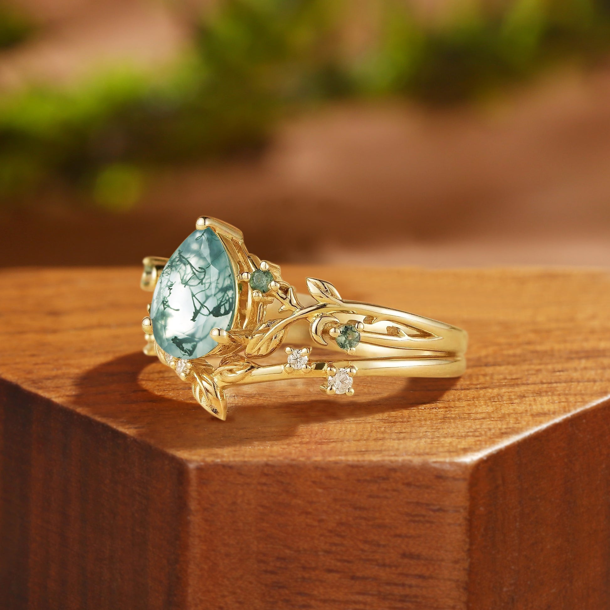 Inspired by nature's elegance, this bridal set features a pear-cut moss agate, its organic inclusions echoing a forest floor. Delicate leaf motifs engraved across both bands symbolize growth and unity. Accented with sparkling moissanites, the design captures the timeless beauty of the natural world for a truly enchanting union.