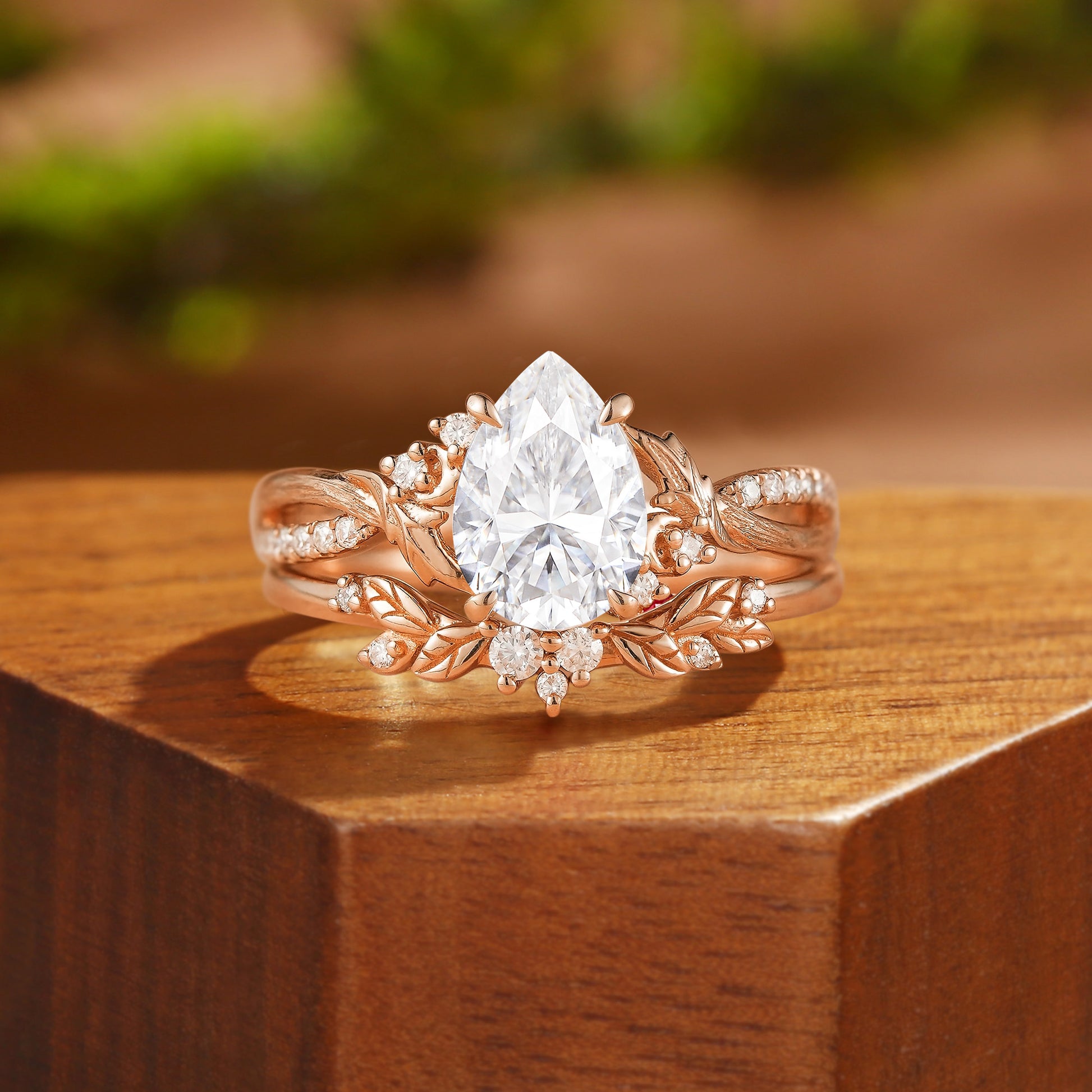 Clarissa - Celestial Pear Moissanite with Leafy Engagement Ring Set 2pcs