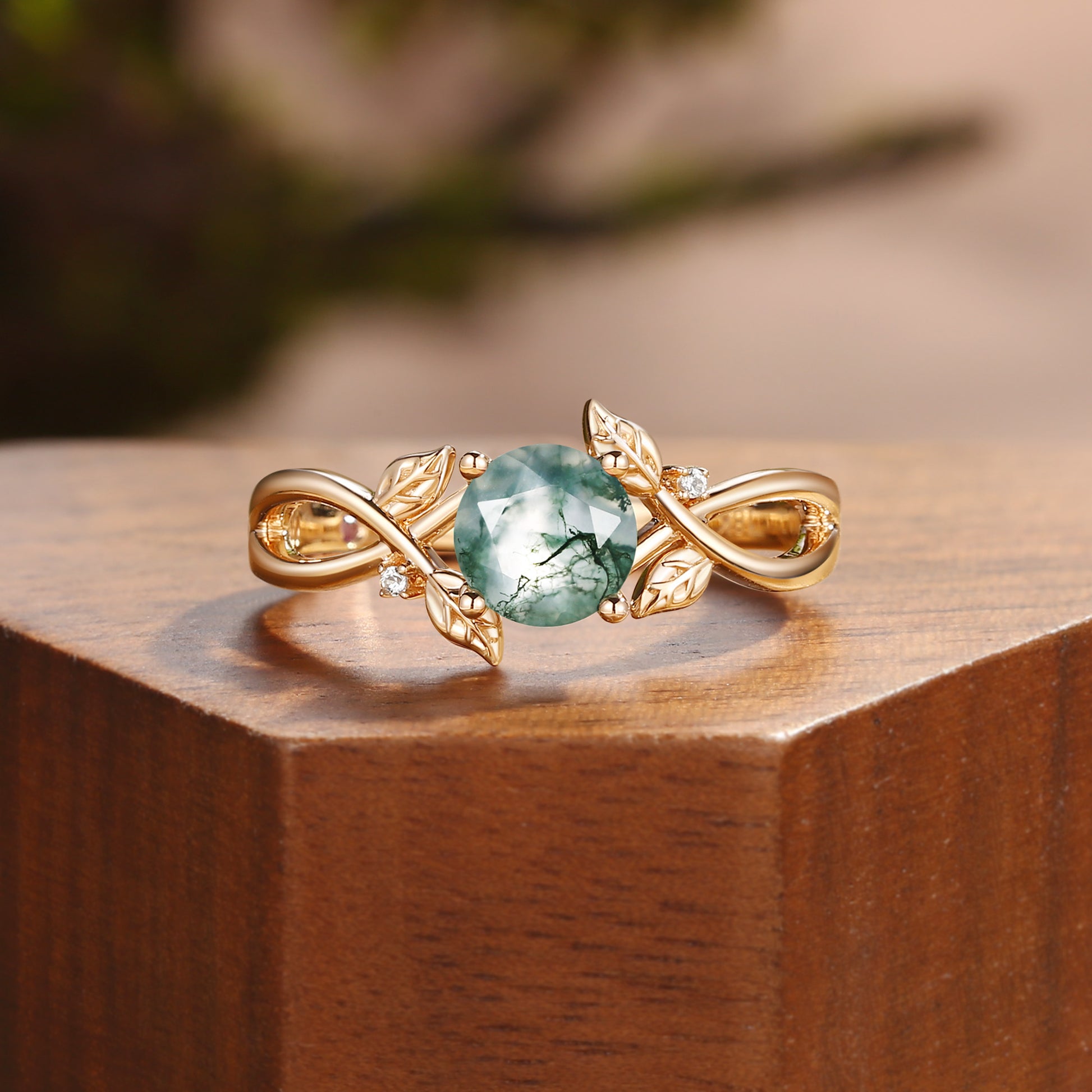 Cordelia - Nature Inspired Round Cut Moss Agate Yellow Gold Engagement Ring