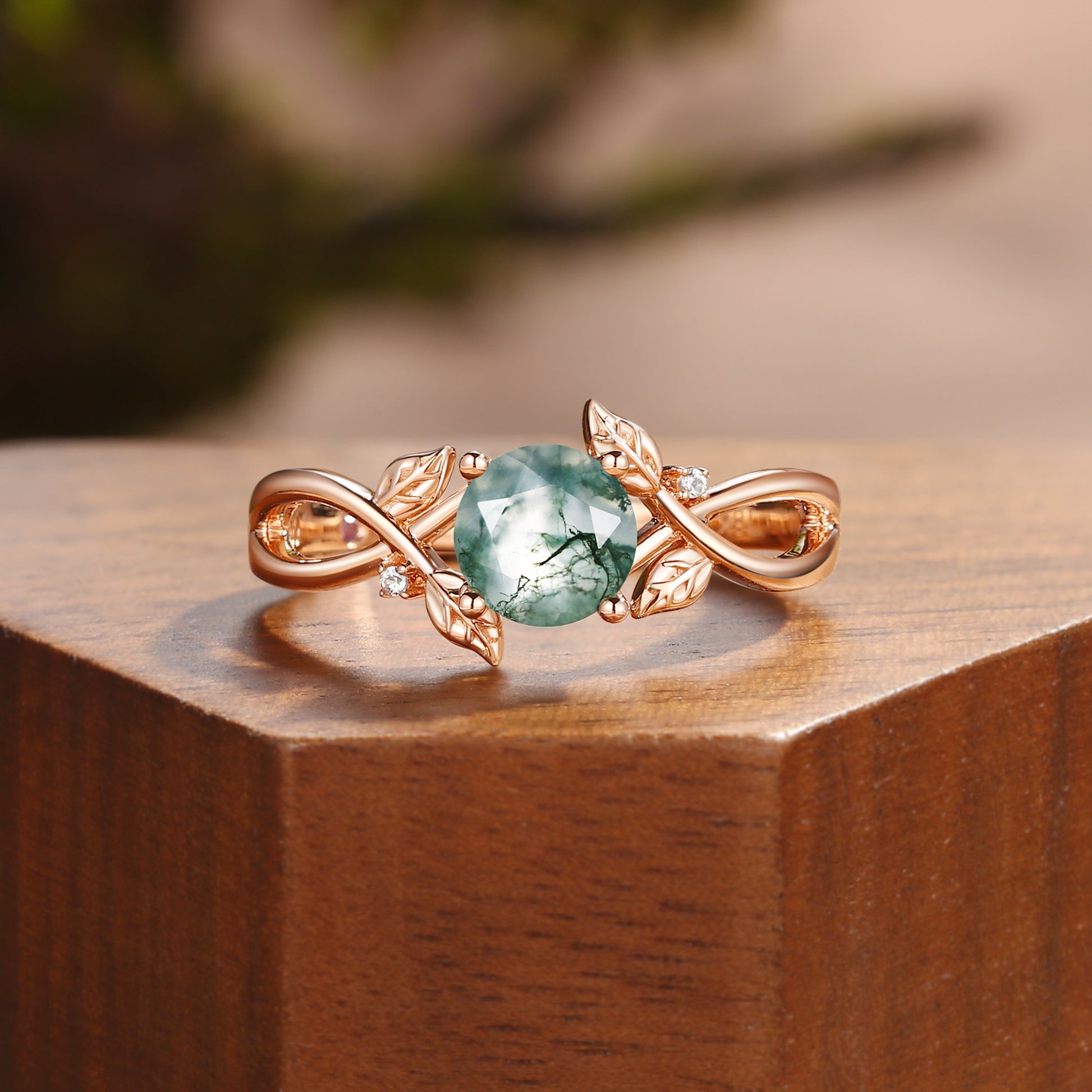 Experience elegance and luxury with our Cordelia - Nature Inspired Round Cut Moss Agate Yellow Gold Engagement Ring. Crafted with precision, this set features a stunning round cut Moissanite stone in a delicate leaf design. The yellow gold band adds a touch of warmth to the overall look. Perfect for any bride looking for a unique and sophisticated ring set.
