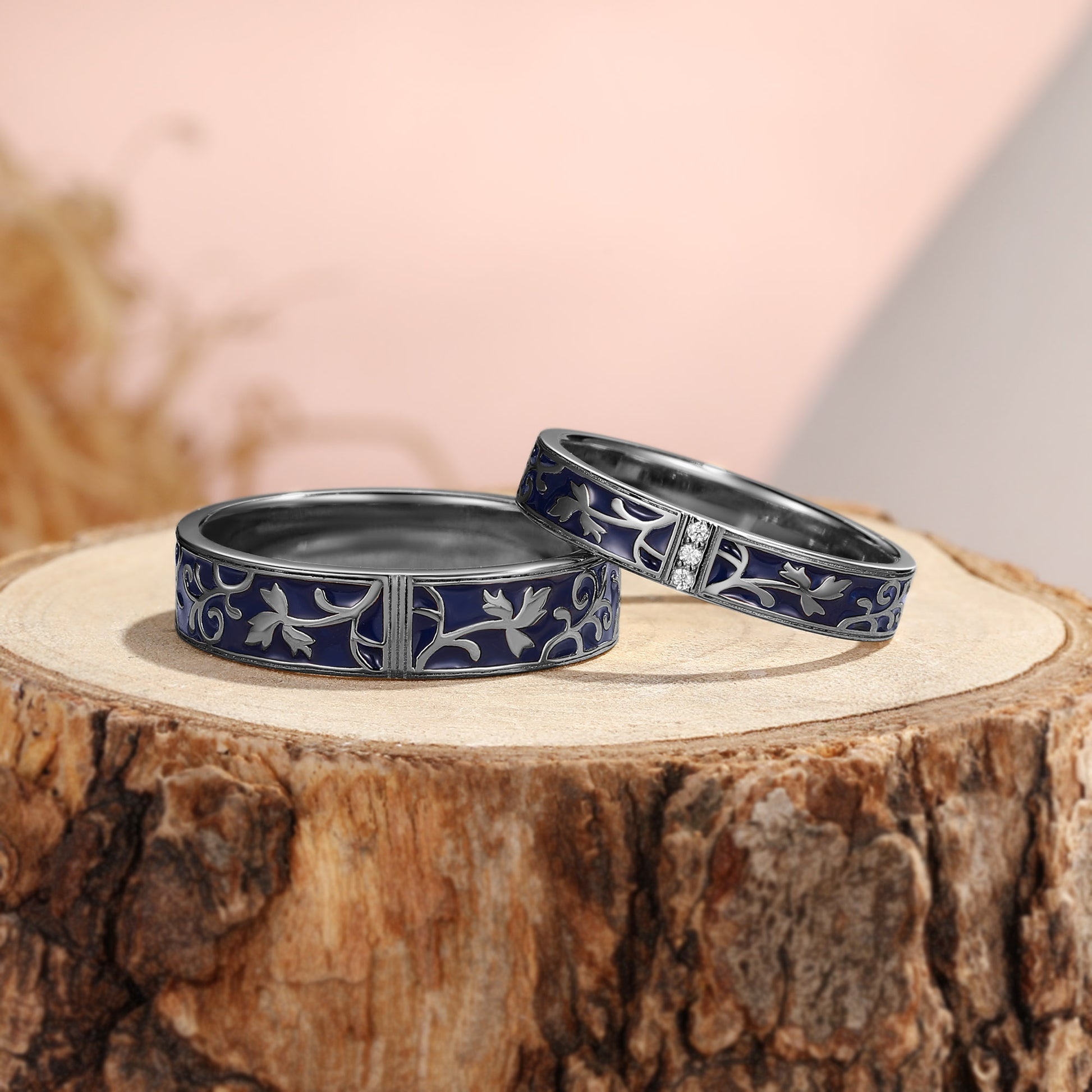 Deep Blue Enamel Floral Vine Couple Ring Set - Elara