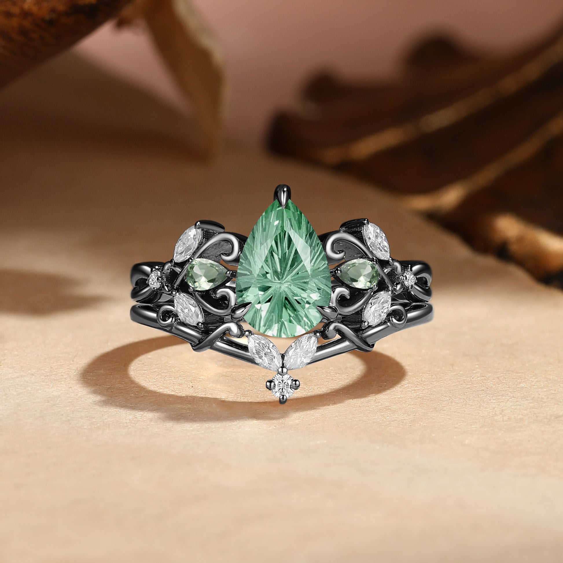 Drisana - Vintage Fireworks Cut Pear Green Sapphire Branch Bridal Set 2pcs