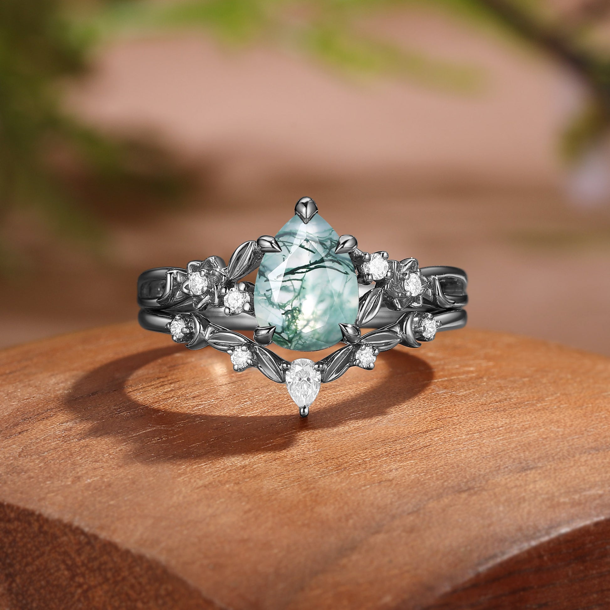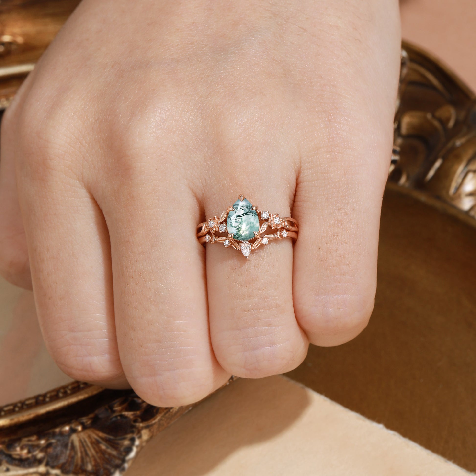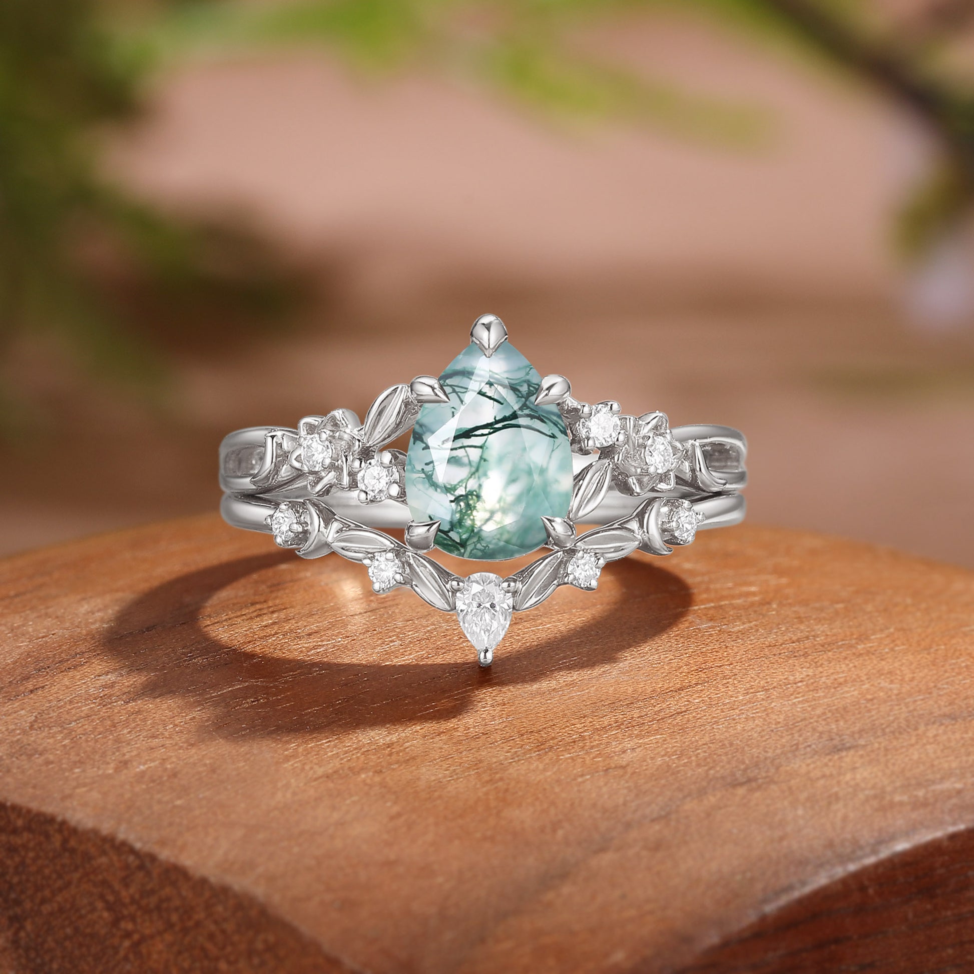 The Sylvie Bridal Set draws you into an enchanted woodland, where a Pear-cut Moss Agate centerpiece glows with the quiet magic of a hidden forest. Delicate leaf clusters and a gracefully curved band adorned with a Pear-cut Moissanite complete this ethereal gold — a celebration of nature's wild, timeless beauty for your most magical day.