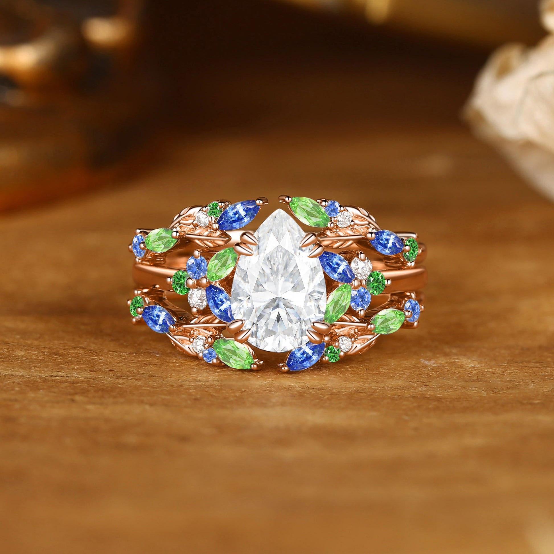 Fall in love with the Jasmine - Monet's Garden Moissanite Leaf Ring Bridal Set. Adorned with lab sapphire and lab emerald accents, this ring set evokes the beauty of Monet's garden. Made with moissanite, its brilliance will last a lifetime.