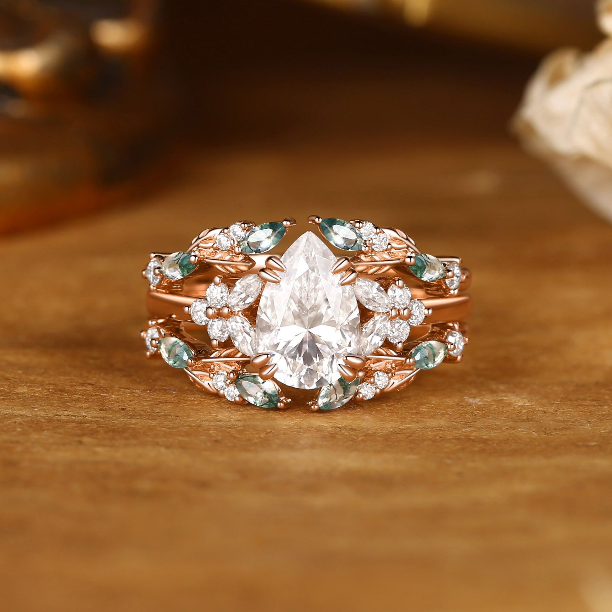 Jasmine - Vintage Pear Cut Moissanite Cluster Moss Agate Leaf Ring Bridal Set