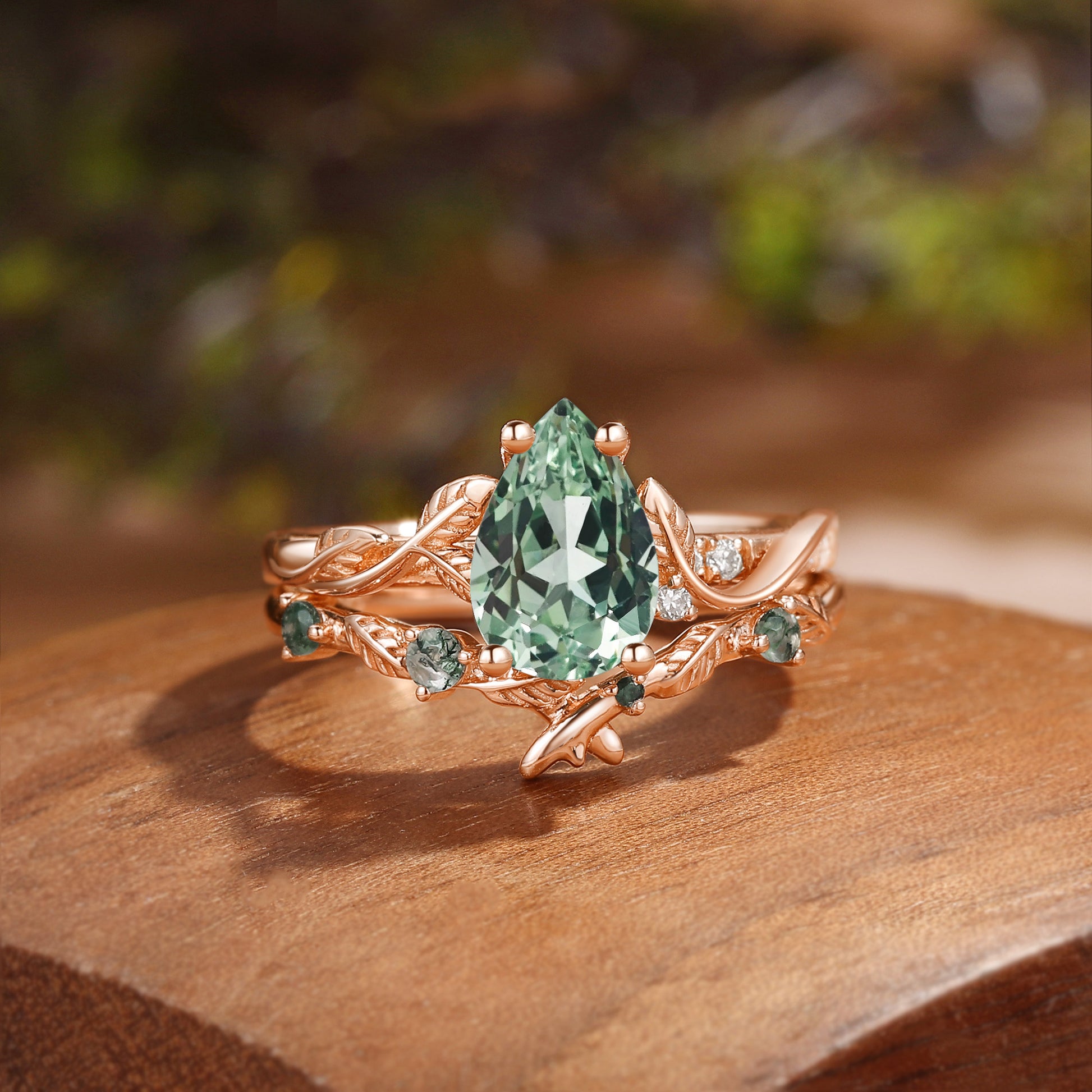 Leafy Inspired Pear Cut Green Sapphire Ring Bridal Set 2pcs - Belinda