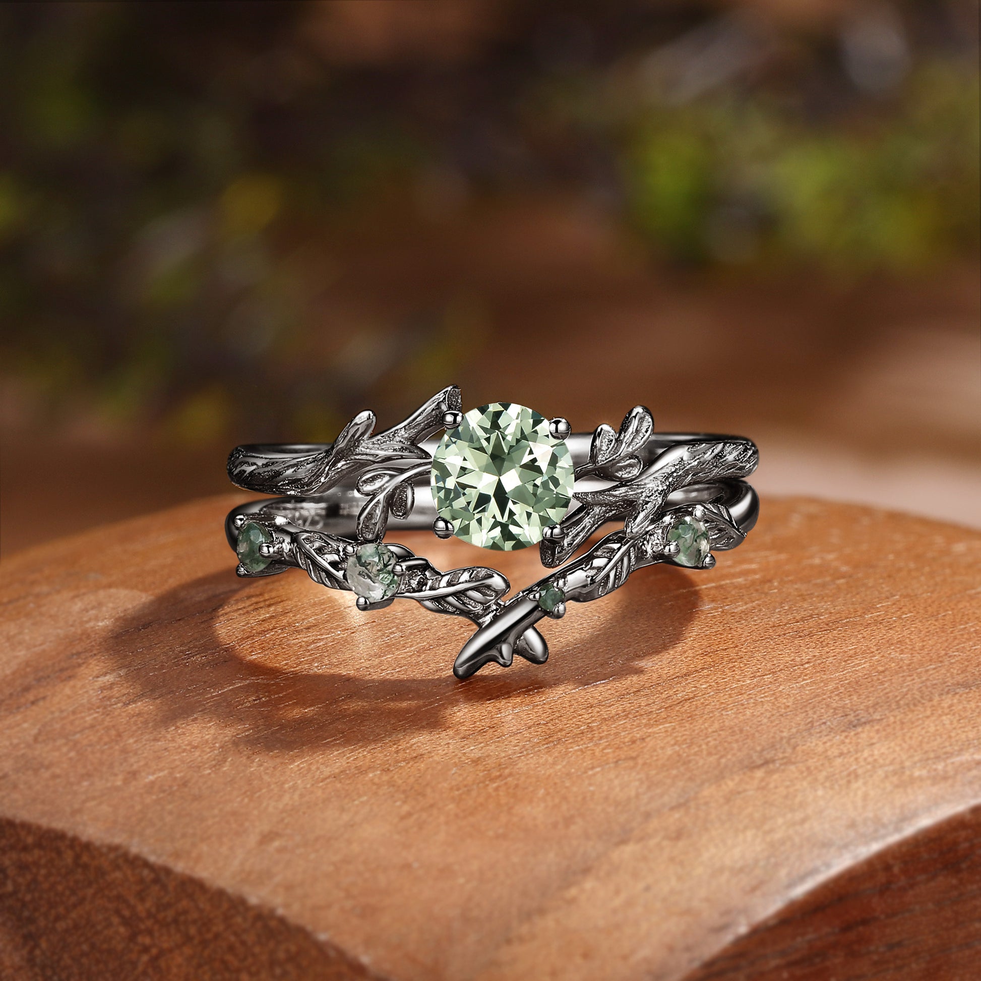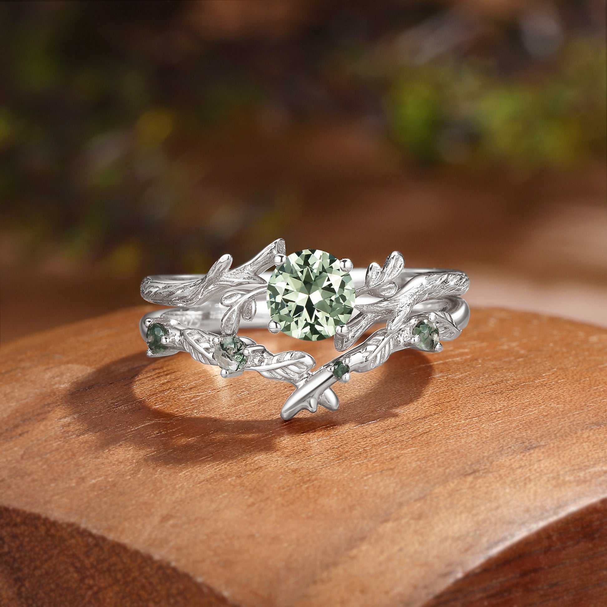 Leafy Inspired Round Cut Lab Green Sapphire Engagement Ring Set 2pcs - Zoe