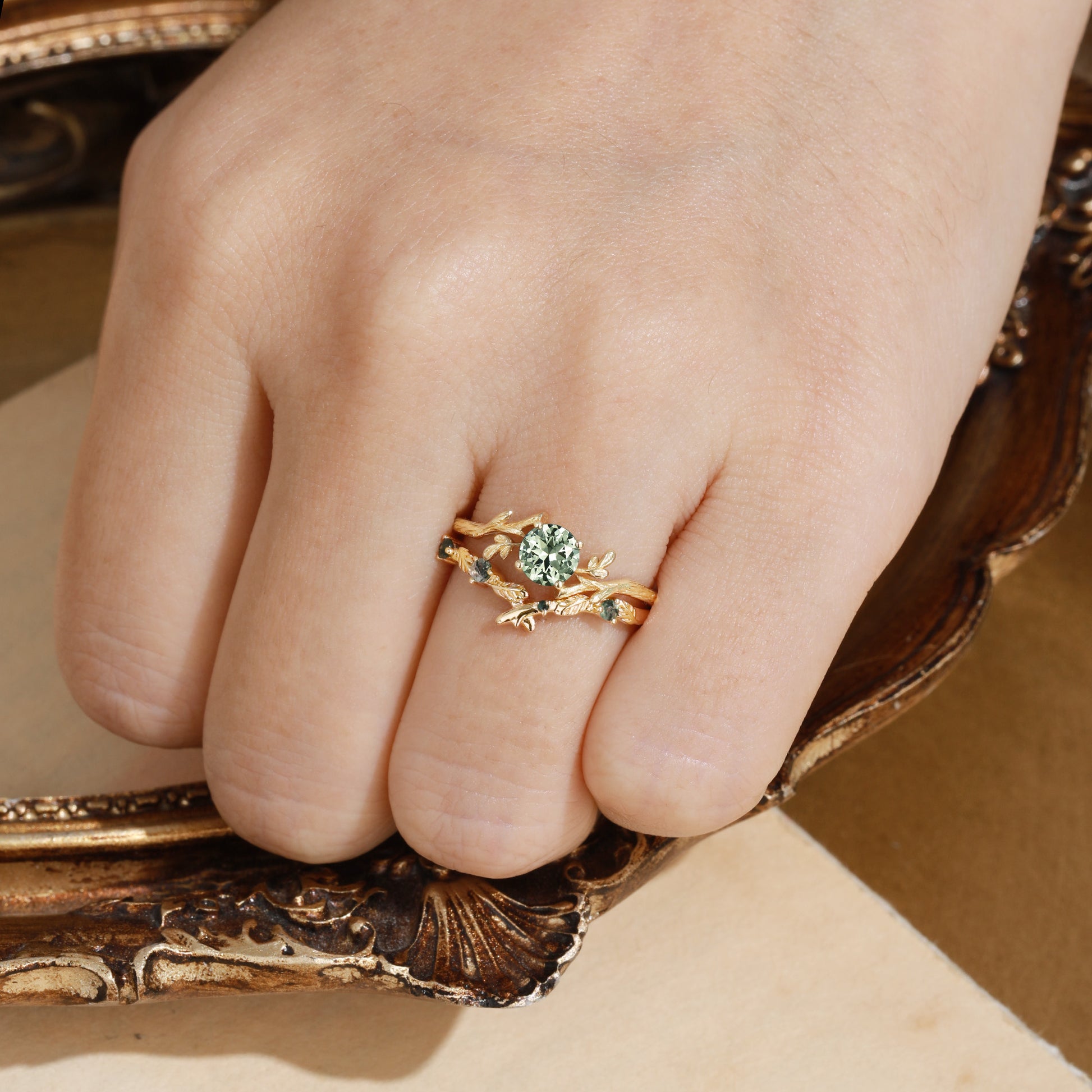 Wrap your love and commitment in the Leafy Inspired Round Cut Lab Green Sapphire Engagement Ring Set 2pcs - Zoe. This elegant engagement ring features a round cut lab green sapphire that symbolizes loyalty and devotion. Its timeless design will last a lifetime, making it the perfect choice for a special moment.