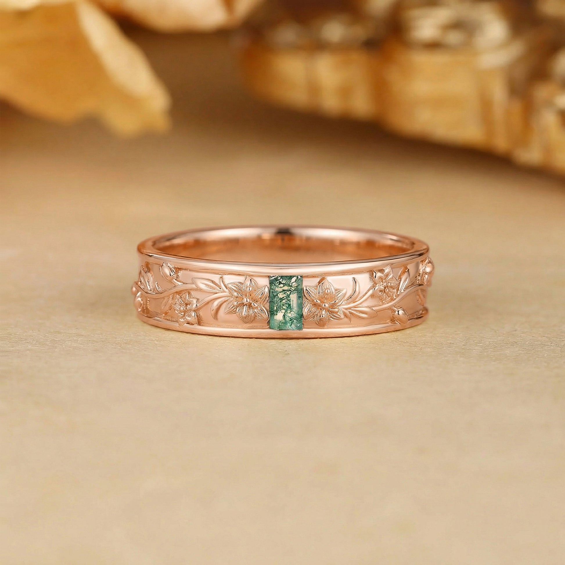 Men Band - Art Deco Emerald Cut Moss Agate Flower Inspired Engraved Ring