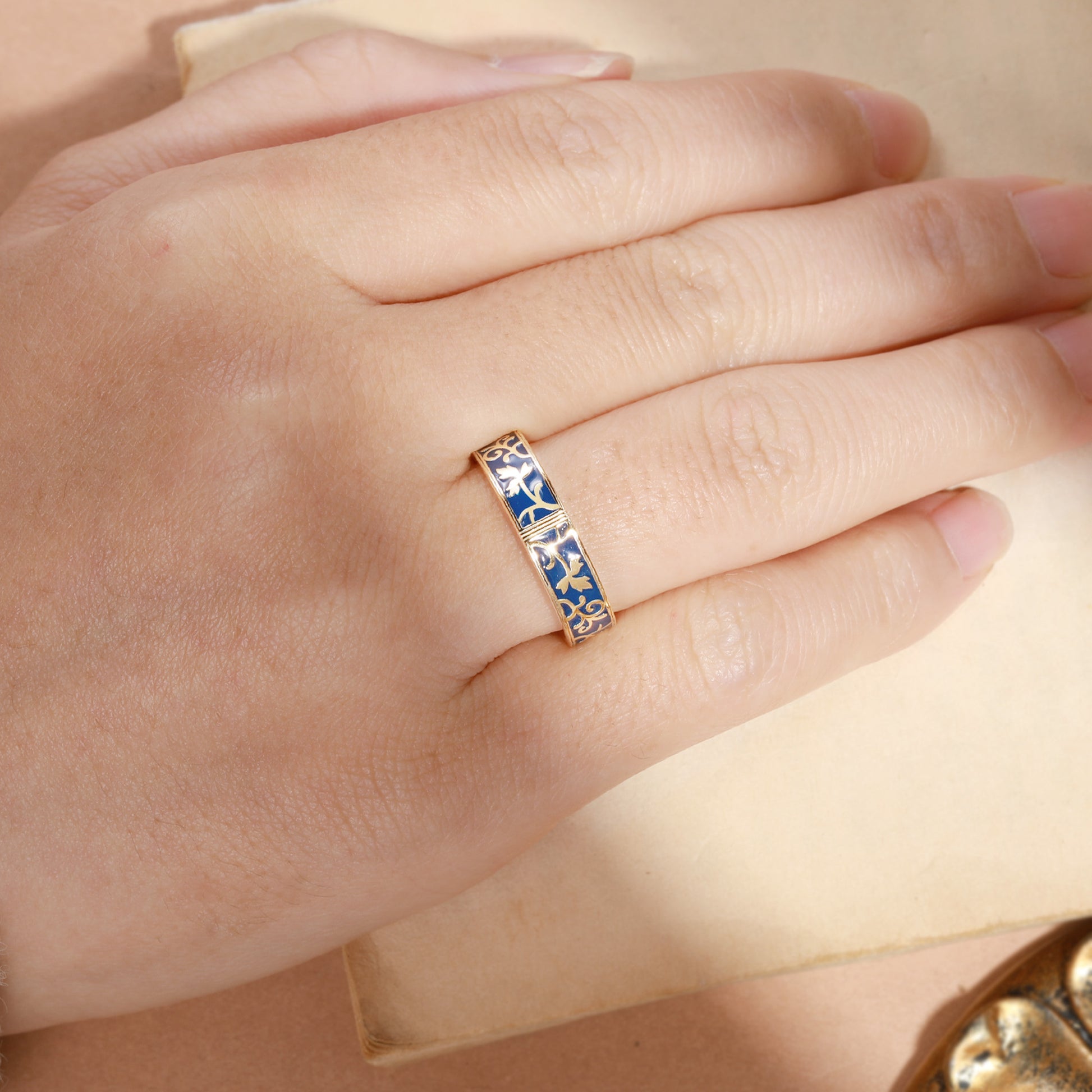 This men's wedding band features the elegant Aldric - Navy Blue Enamel Floral Vine Gold Art Nouveau Inspired Men's Wedding Band. With intricate hand-engraved vine detailing and rich navy blue enamel accents, it wraps the finger like a timeless garden in bloom—symbolizing strength, loyalty, and unbreakable devotion.