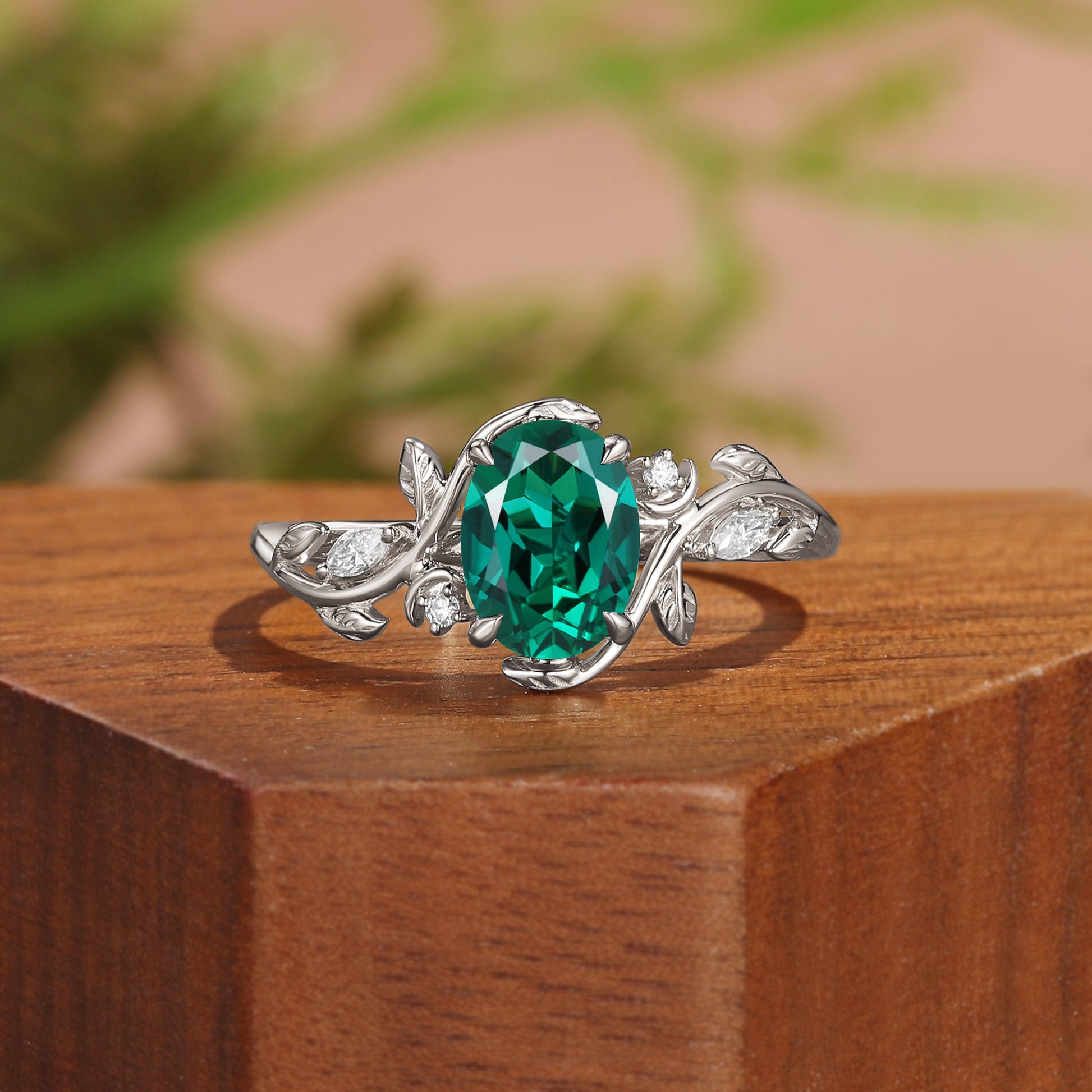 Oval Cut Lab Emerald Branch Leafy Engagement Ring - Désirée