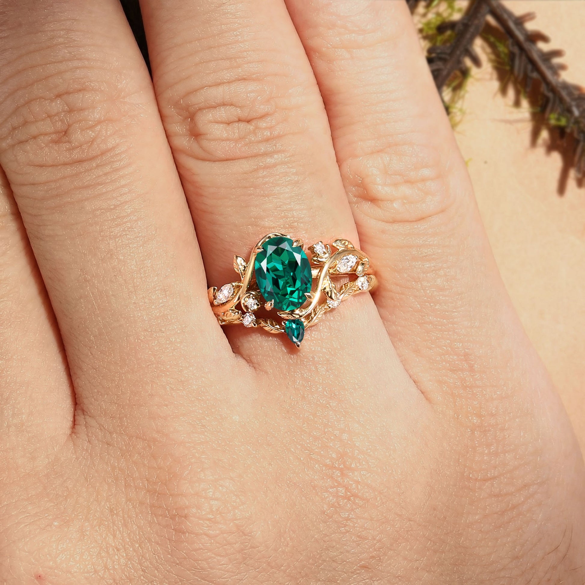 Oval Cut Lab Emerald Branch Leafy Inspired Bridal Set 2pcs - Désirée