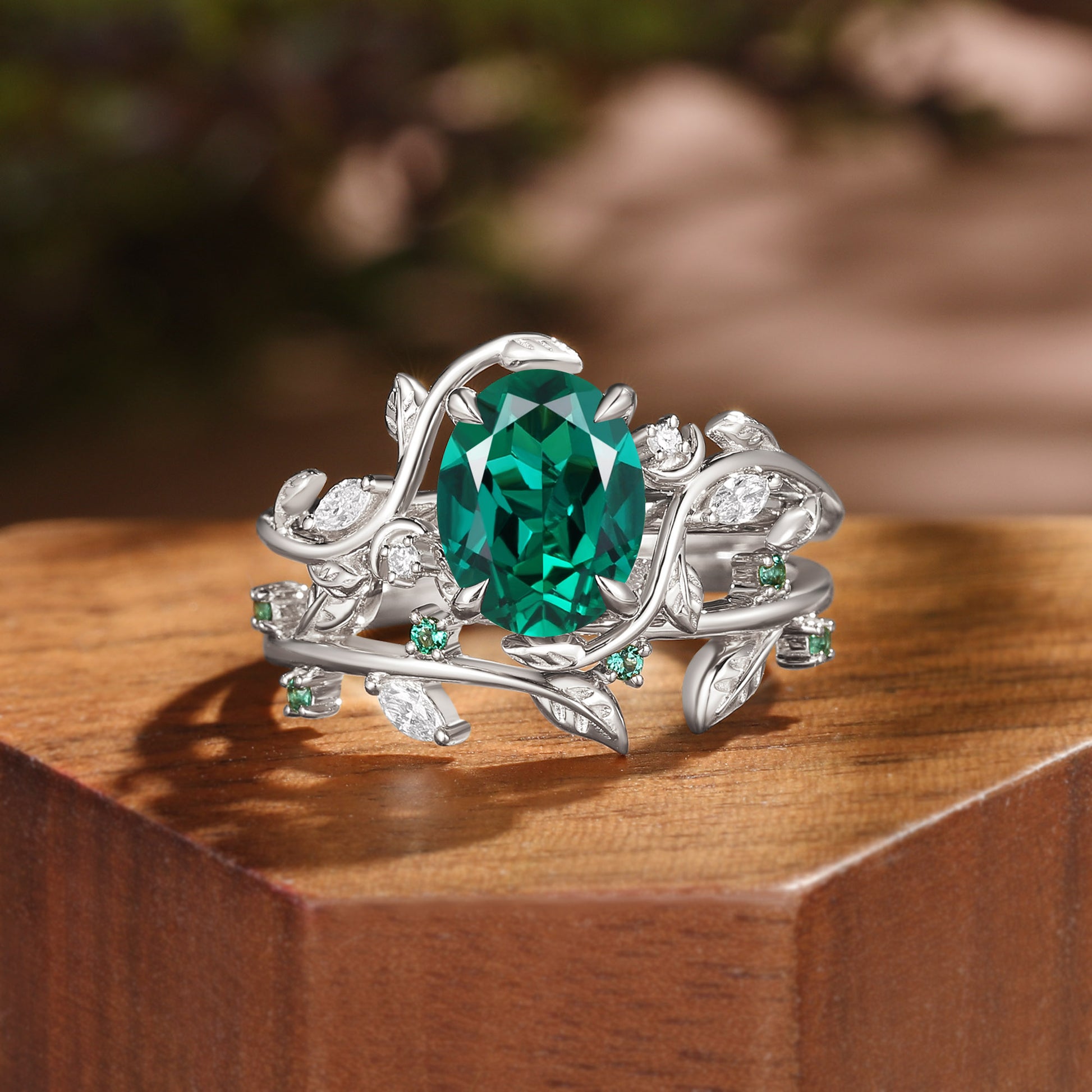 Oval Cut Lab Emerald Nature Leafy Inspired Engagement Ring Set 2pcs - Désirée