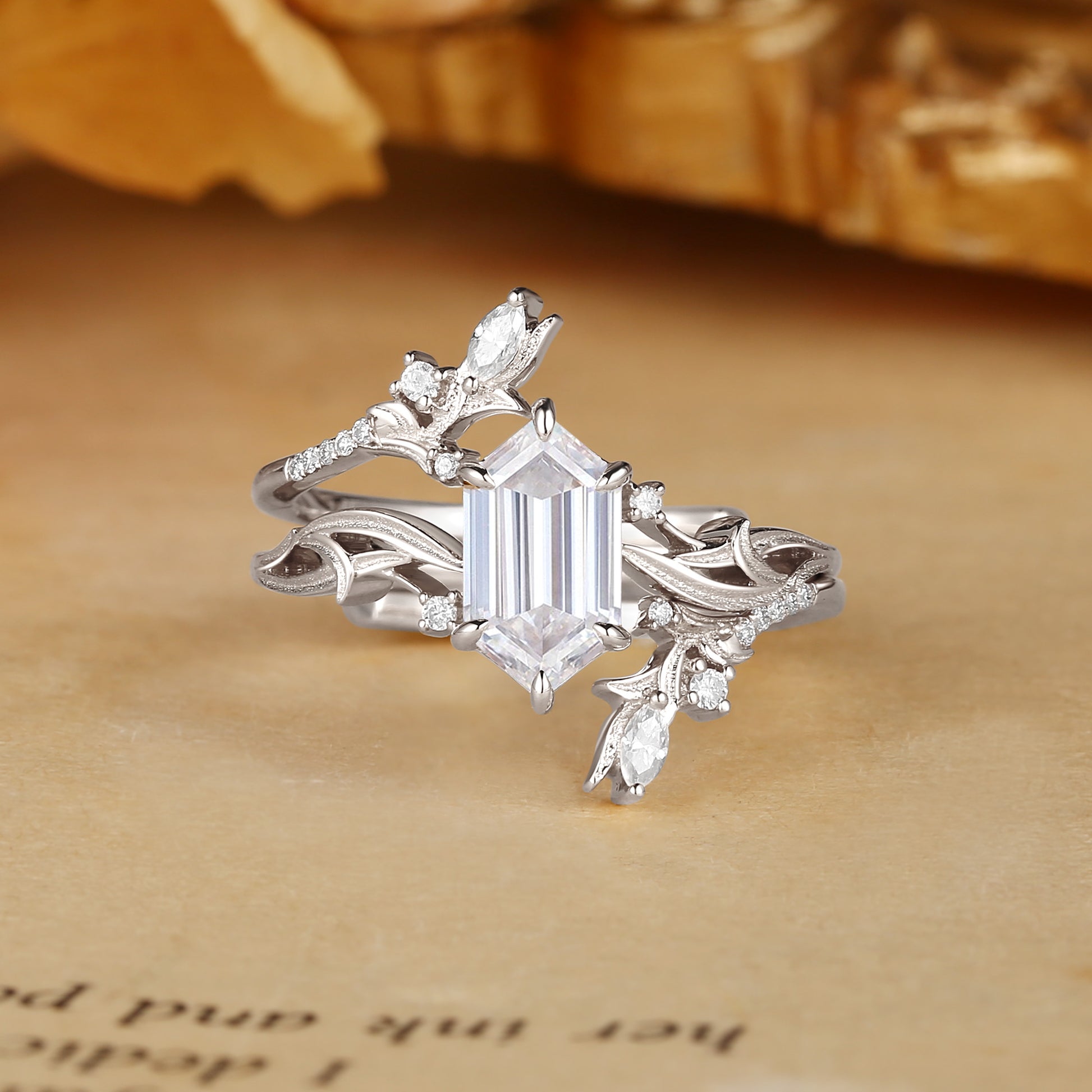 Quorina - Hexagon Cut Moissanite Leafy Nature Inspired Twist Enhancer Ring 2pcs
