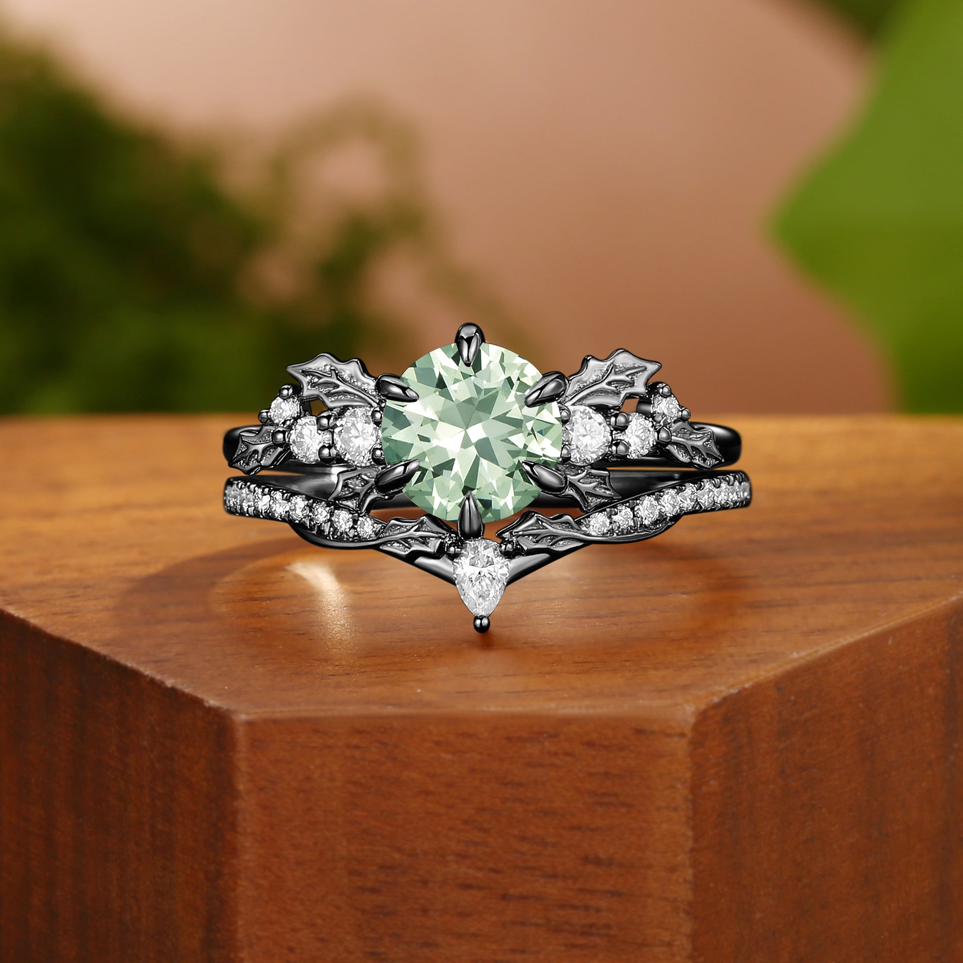 Round Cut Green Sapphire Holly Leaf Yellow Gold Bridal Set 2pcs - Victoria