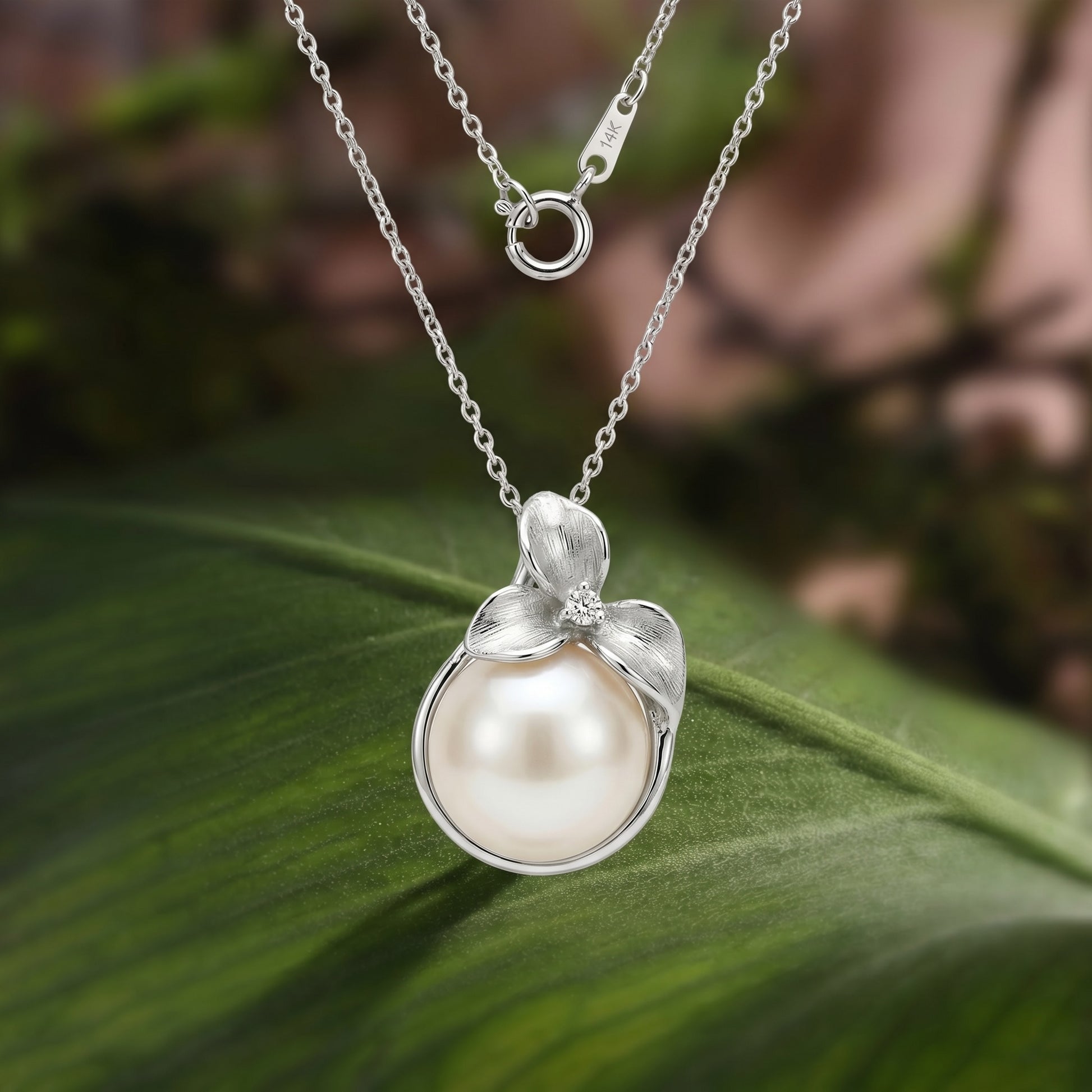 Step into the soft hush of a secret garden with the Pearl Bloom necklace, where a luminous freshwater pearl rests like a moonbeam cradled by nature itself. The flawless round pearl glows with an inner warmth—its milky iridescence shifting between ivory and the palest blush, as though it holds within it the memory of still, silver water.