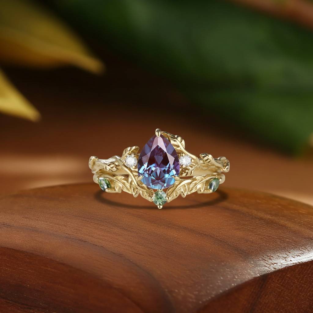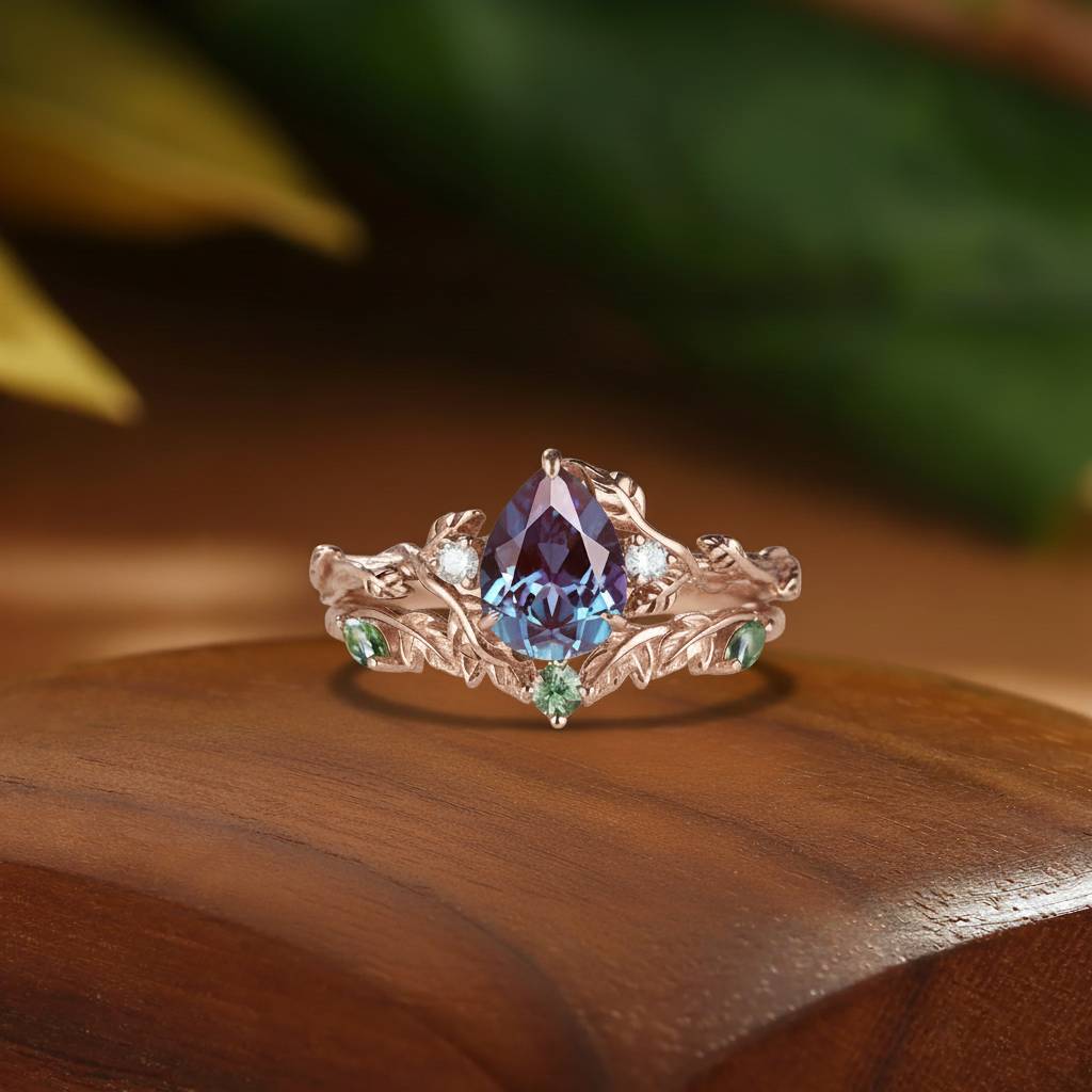 Sage - Vintage Pear Cut Alexandrite Leaf Floral Engagement Ring Set 2pcs