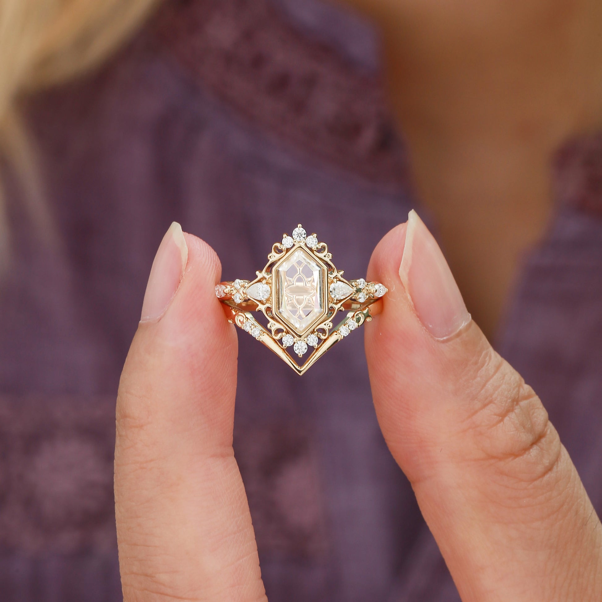 Embrace timeless elegance with the Swan Bridal Set, featuring a stunning portrait-cut hexagon moissanite centerpiece. This vintage-inspired two-piece set captures classic beauty with its intricate design and sparkling brilliance, perfect for celebrating your special day with enduring charm and sophistication.