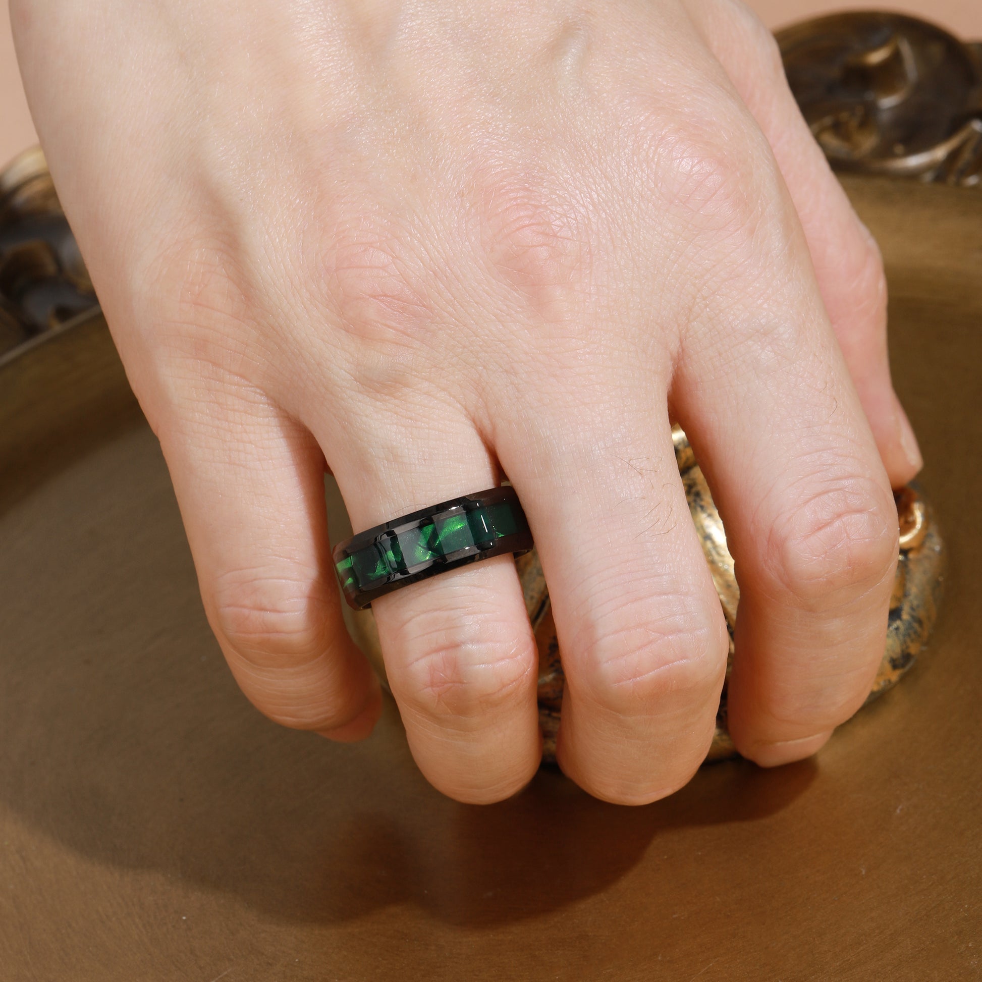 This men’s wedding band features a distinctive black inlay accented by a vivid green forest fairy design, combining bold elegance with a touch of nature-inspired mystique. Crafted with precision, it offers a unique symbol of commitment that stands out while maintaining timeless sophistication. Perfect for those seeking a meaningful ring with an artistic edge.