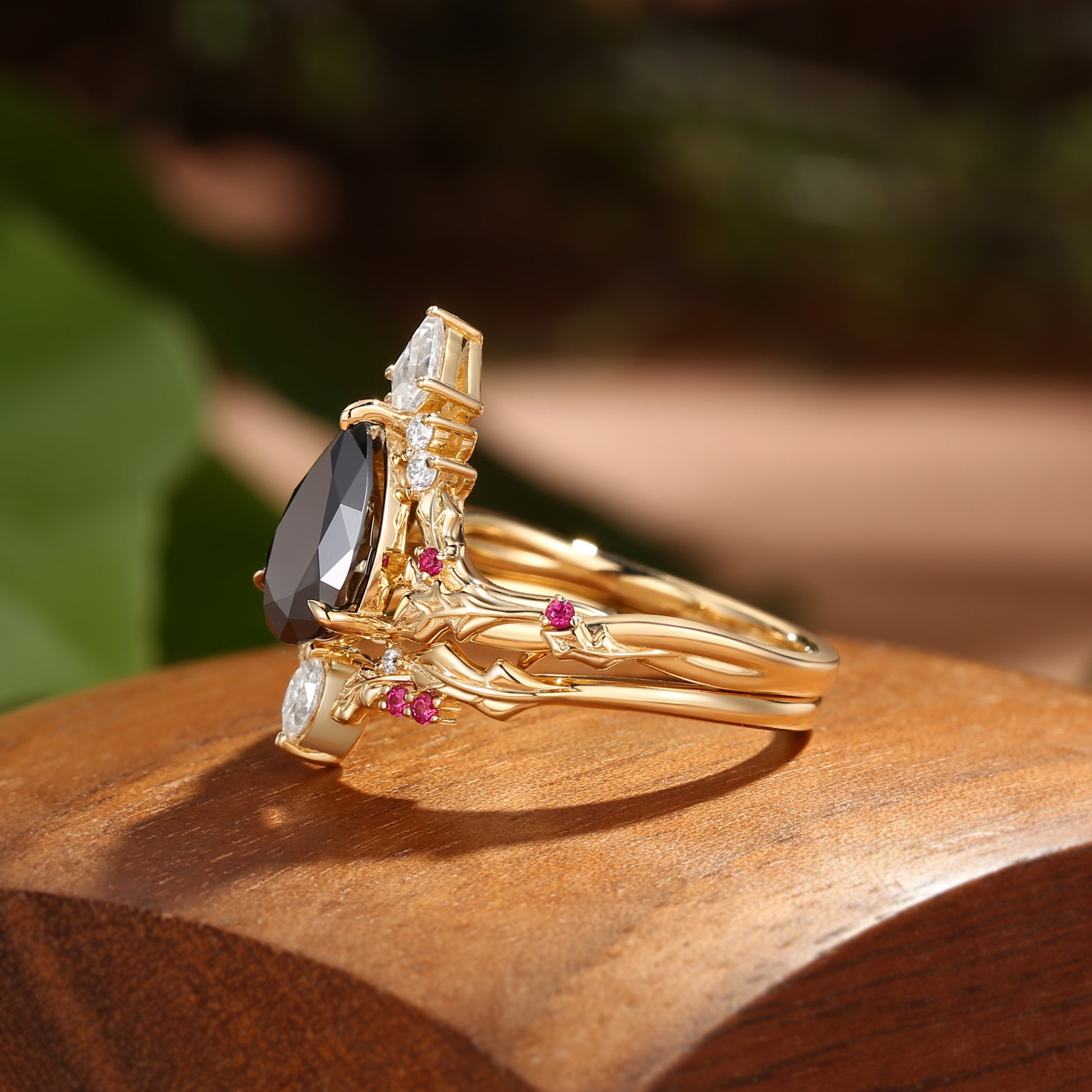 Enter a realm of dark enchantment with the Victoria Engagement Ring Set. Featuring pear-cut black moissanite and natural ruby stones, this two-piece design is inspired by the mystical holly leaf, blending deep, rich hues with nature's magic. Perfect for the bride who seeks a bold, fantastical statement, Victoria captures the allure of a forgotten fairy tale filled with elegance and mystery.