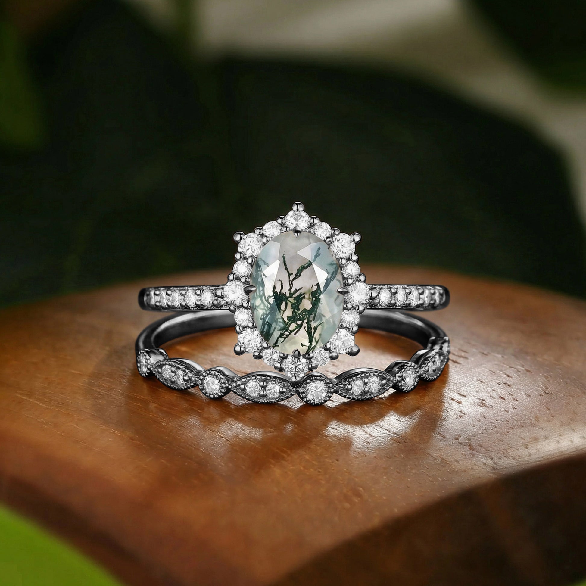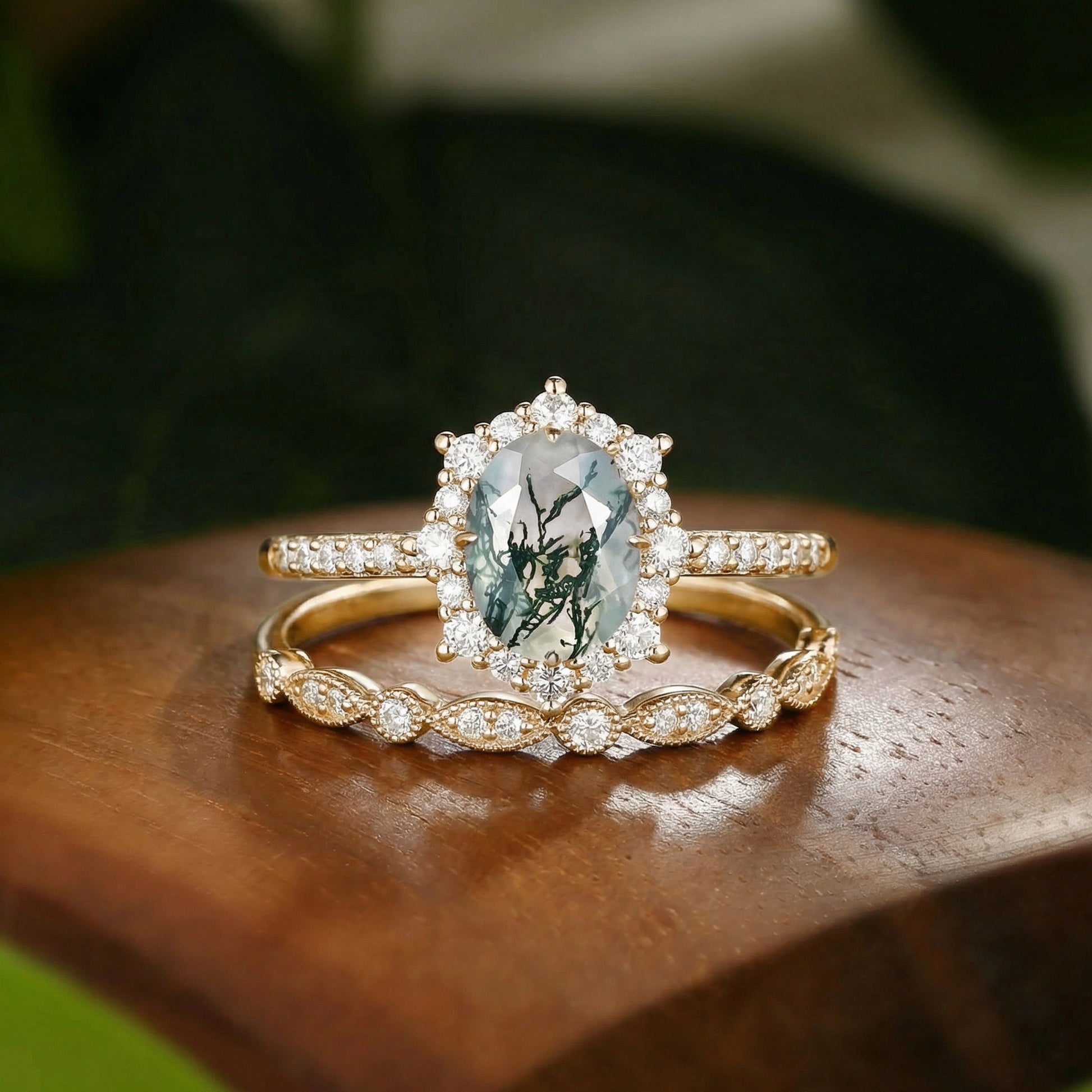 Vintage Oval Cut Moss Agate Halo Milgrain Bridal Set 2pcs - Perdita
