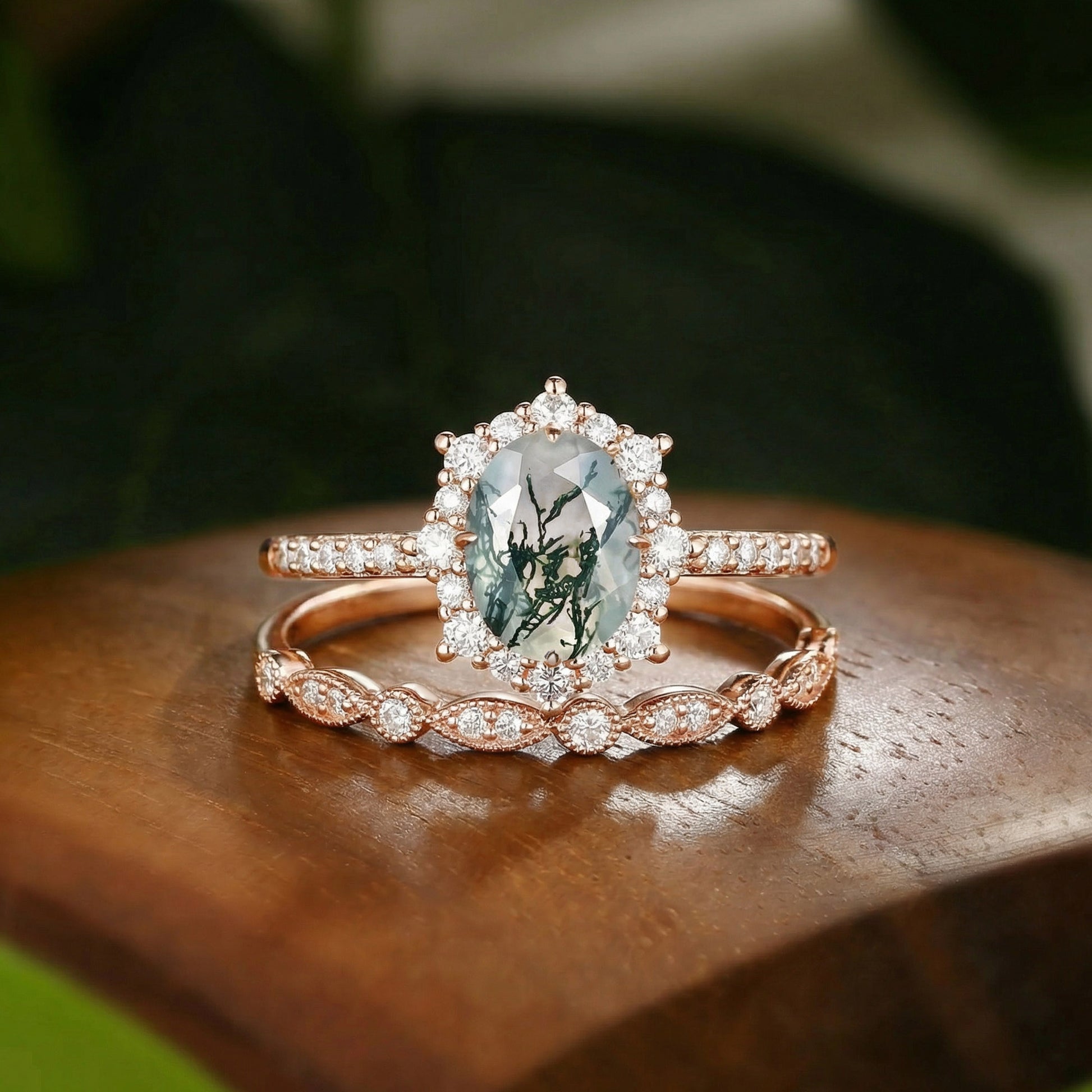 Inspired by the quiet magic of a mist-veiled morning garden, the Perdita bridal set features an Oval Moss Agate, its deep botanical inclusions painting a private landscape of ancient ferns and trailing vines within the stone. A crown of sparkling moissanite rounds forms a radiant halo in warm rose gold, drawing the eye to the agate's ever-shifting depths like sunlight breaking through a forest canopy.